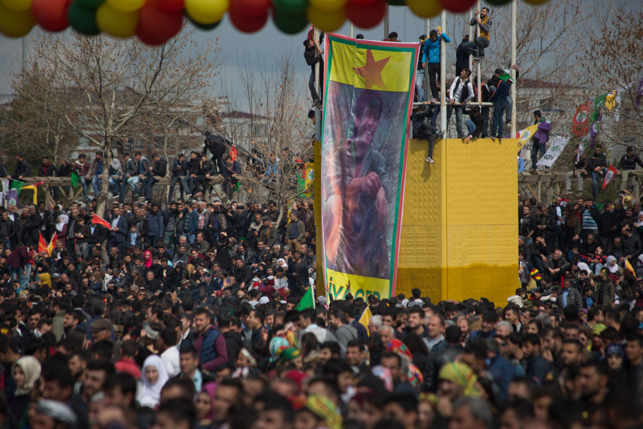 Malgré une fouille conséquente à l'entrée du Newroz Park à l'occasion de la célébration du nouvel an kurde, de nombreux symboles interdits furent exhibés, comme ce portrait d'un martyr des YPG, les "unités de protection du peuple". Ces derniers sont l'émulation syrienne du PKK (parti des travailleurs du Kurdistan), et combattent l'organisation de l'Etat islamique sur le territoire du Rojava syrien où une société paritaire et multi-ethnique est par ailleurs en train d'être construite.