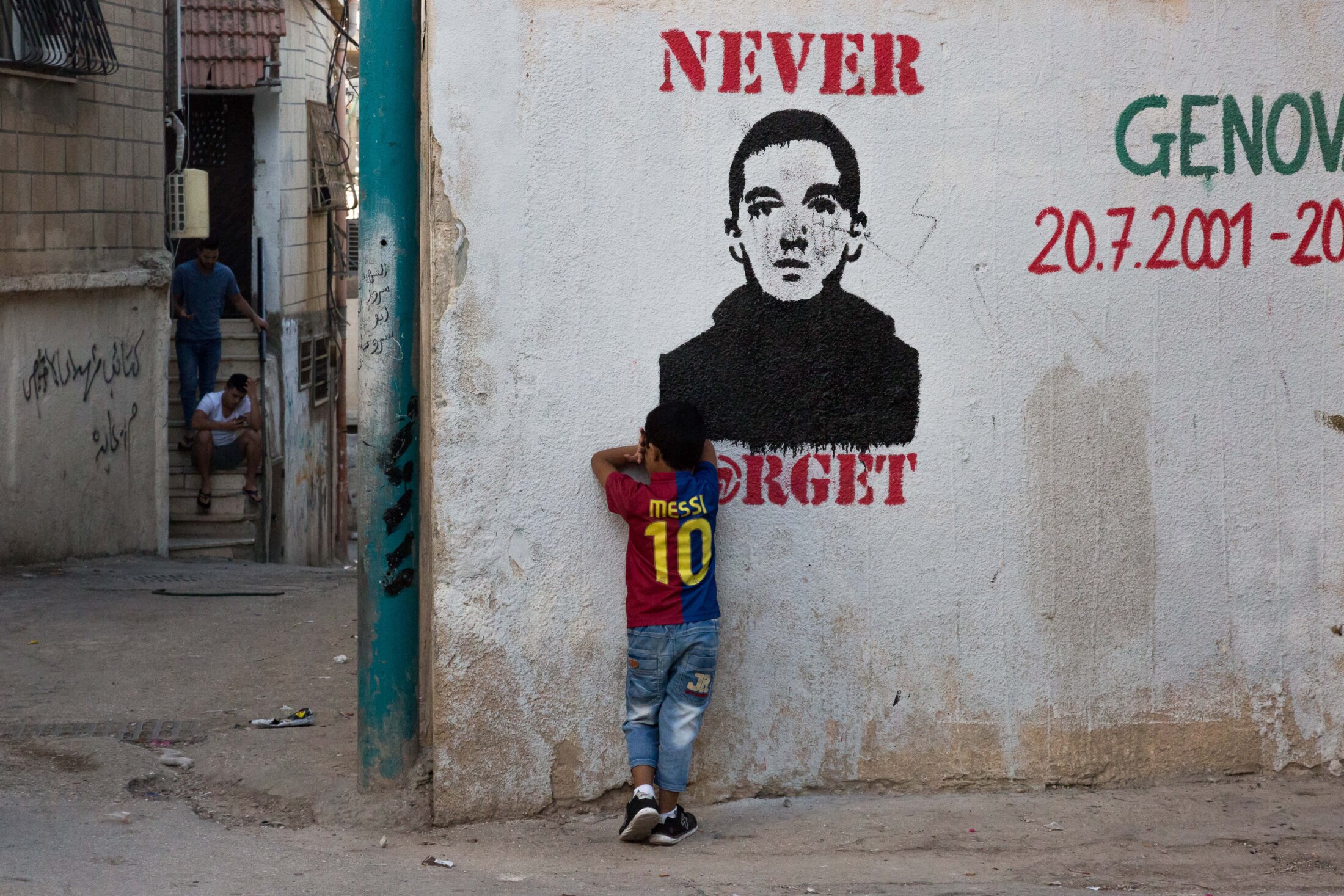 Jeune garçon jouant à cache-cache contre un mur sur lequel est peint le portrait de Carlo Giulani, mort lors des manifestations anti-G8, à Gènes en 2001.