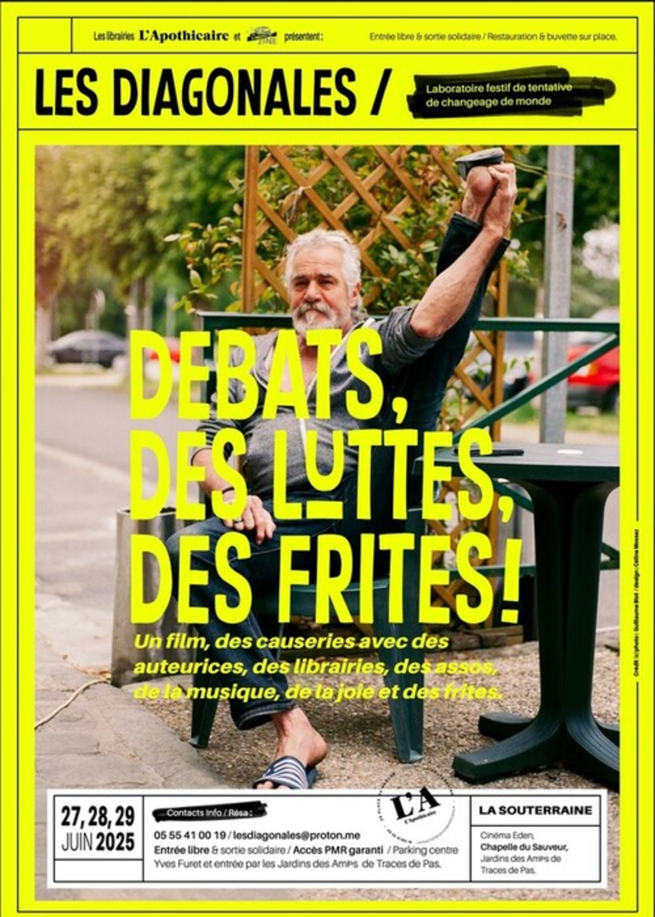 ENTREE LIBRE ET SORTIE SOLIDAIRE :Les Diagonales sont un évènement non subventionné, intégralement financé par les Librairies L'Apothicaire et La Limou'Zine et construit sur la sueur de toustes celleux qui tenaient à voir cet évènement advenir. Le coût de l'évènement sera affiché et chacun‧e pourra donc participer à hauteur de son envie et de ses moyens.