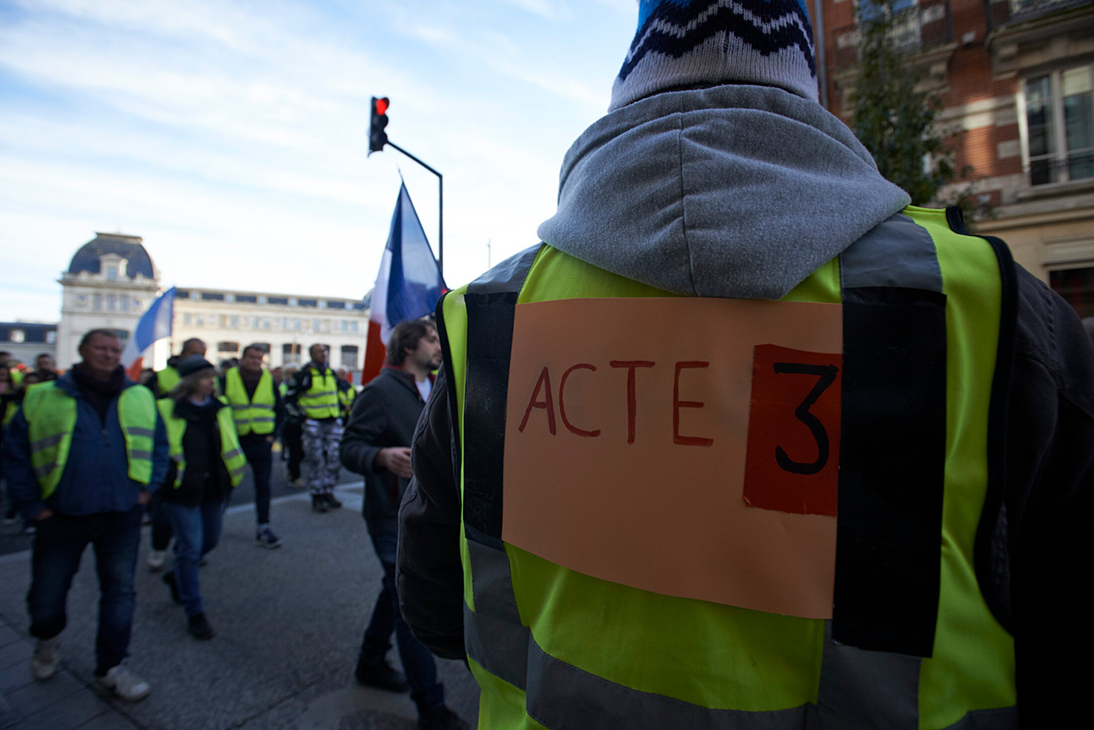Acte III du mouvement de protestation initié le 17 novembre 2018 par des centaines de milliers de gilets jaunes sur les routes de France, avec pour mot d'ordre, vite dépassé, de protester contre la hausse des carburants pour les voitures individuelles. Au fil des jours, les demandes se sont précisées. Aujourd'hui, au mépris répété de l'exécutif répond la colère. Toulouse, 1er décembre 2018.