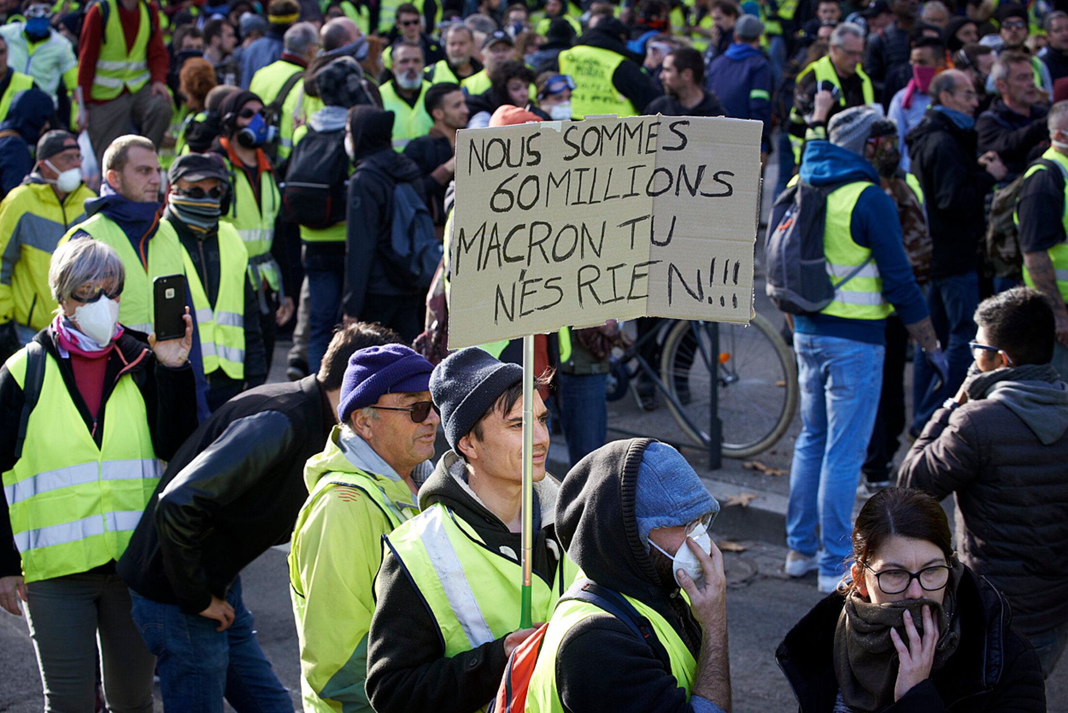 Un masque de Macron en bagnard se bouchant les oreilles devant une foule hurlant "Macron démission". Toulouse, 1er décembre 2018.