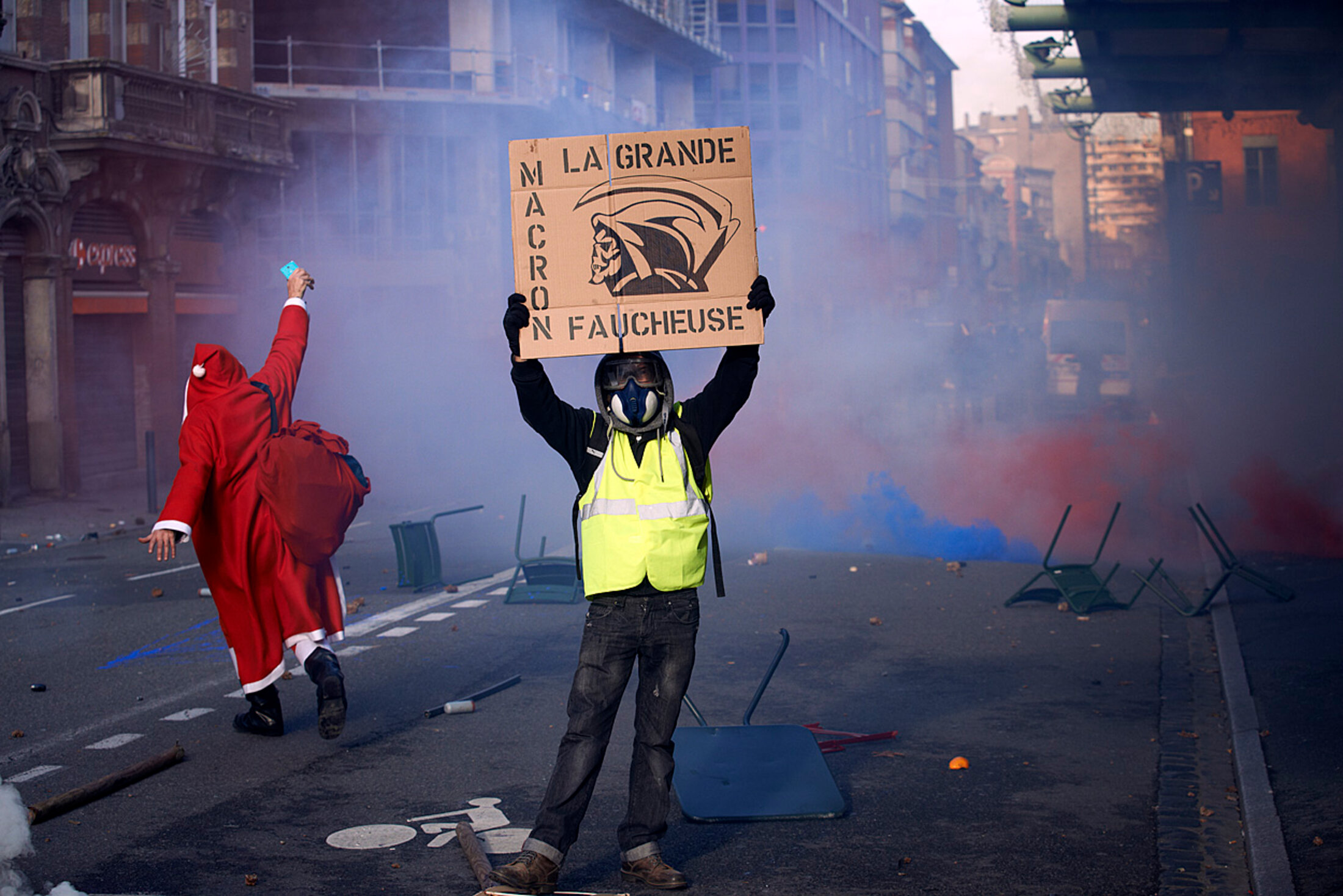 Le mélange des genres dans la rue donne des situations décalées. Dans la dramaturgie, une pointe d'humour. Toulouse, 1er décembre 2018.