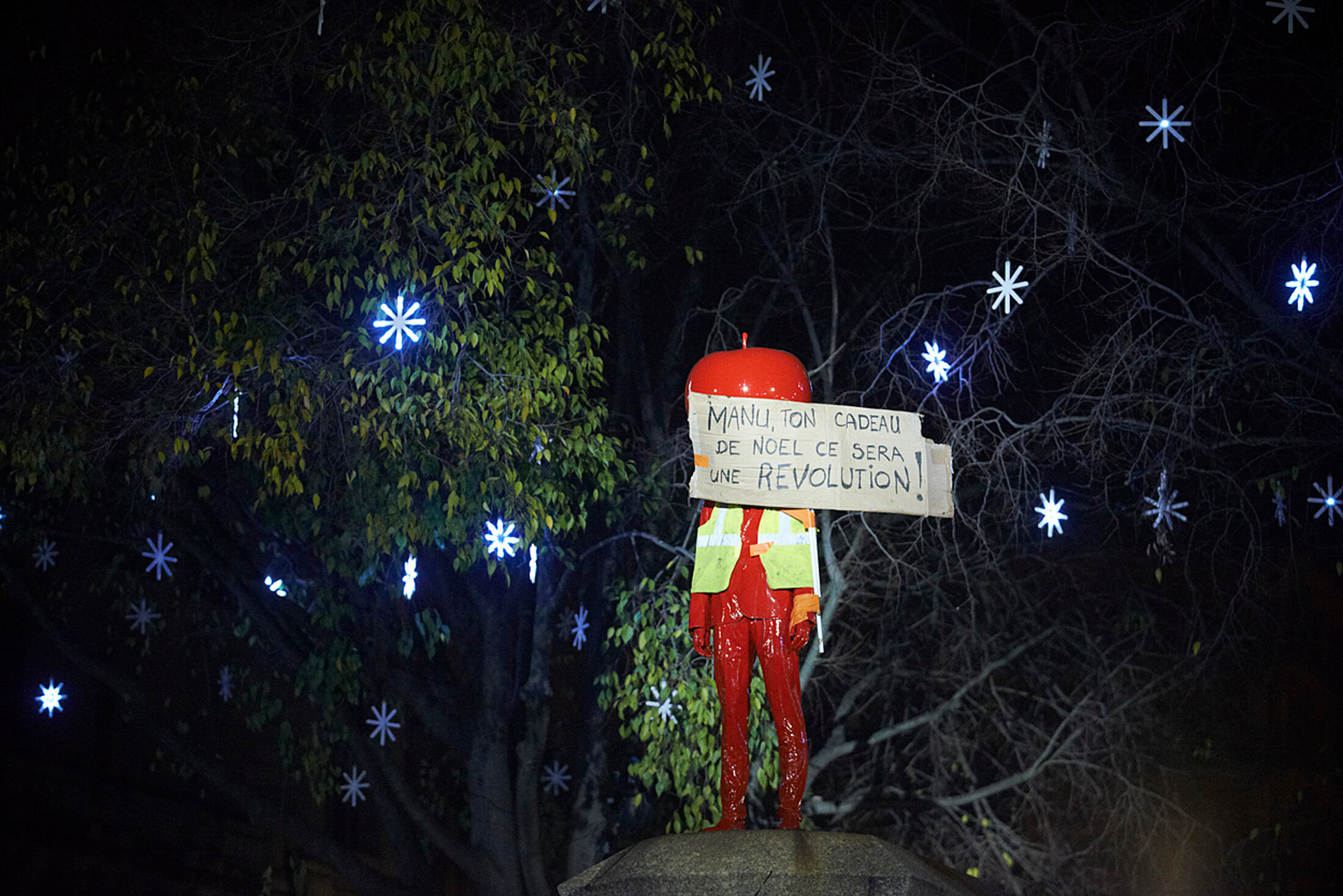 Un message peut-être un peu péremptoire épinglé au gilet porté par l’œuvre d'art remplaçant momentanément Jeanne d'Arc. Toulouse, 1er décembre 2018.