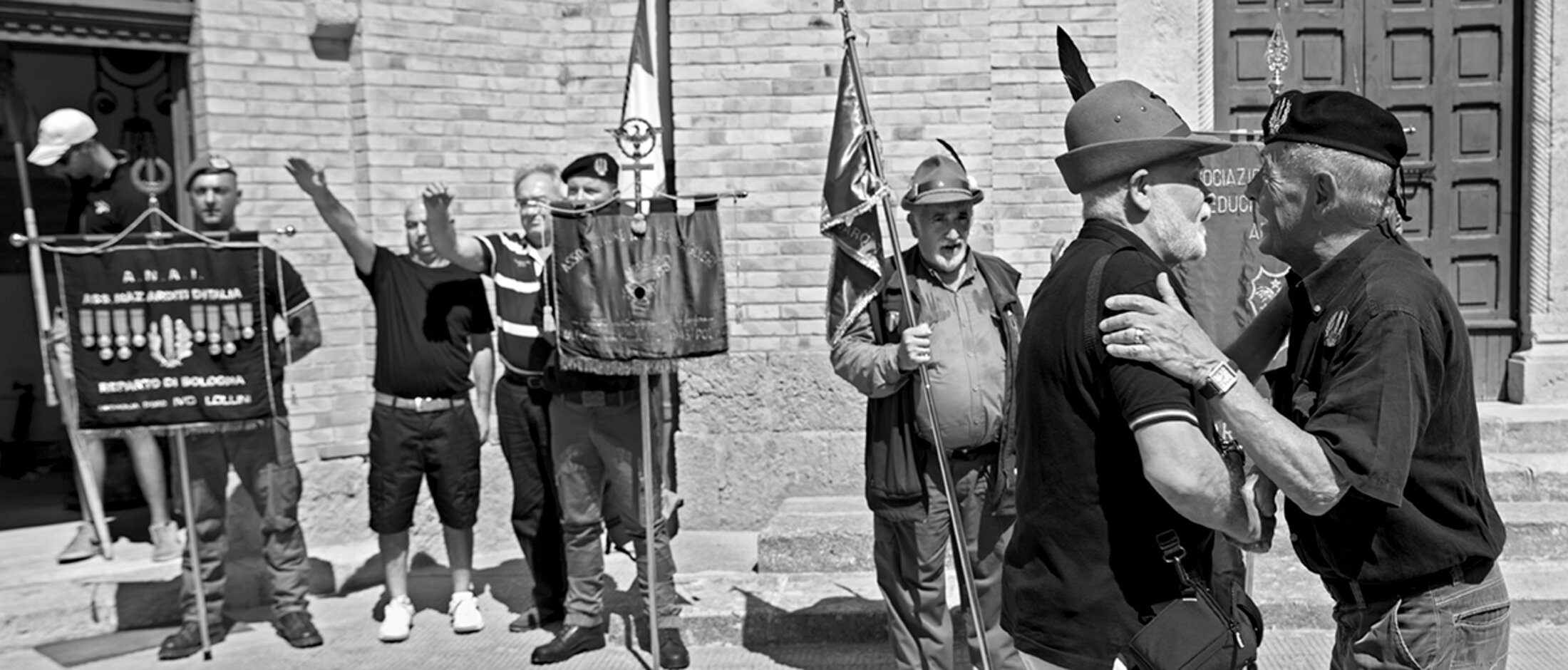 Il y a aussi plusieurs femmes, beaucoup de jeunes et quelques vieillards en uniforme de vétéran, même si un simple calcul mathématique rend difficile de croire qu’ils soient d’authentiques anciens combattants de la république de Salò. Sous le soleil brûlant de juillet, le petit cortège part en direction du cimetière. Le long de la route les habitants de Predappio les observent de leurs maisons, alternant regards indifférents et moqueurs.