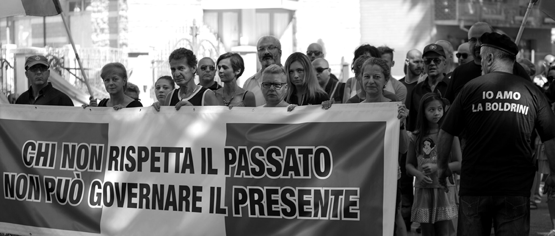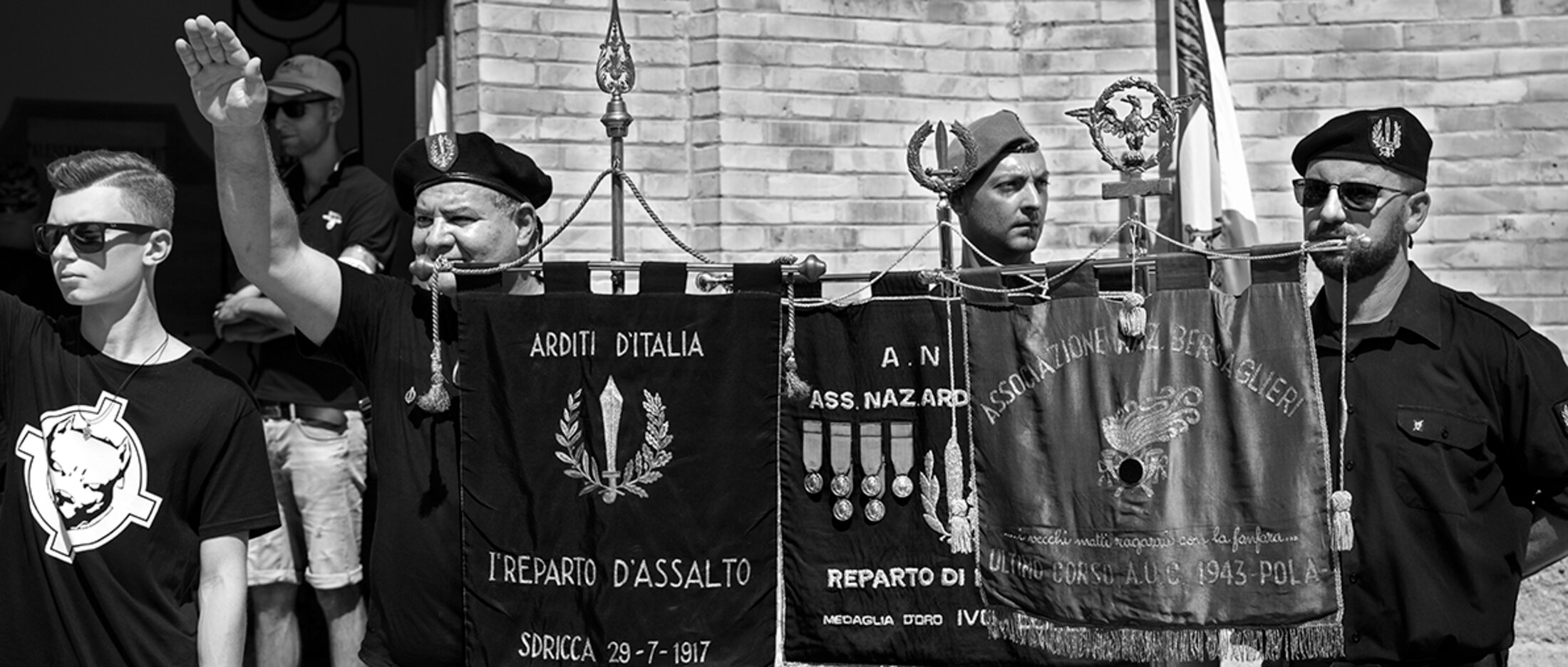 Les nostalgiques fascistes s’affichent avec fierté devant les objectifs des caméras, dans leurs uniformes assortis aux drapeaux de la RSI ( République Sociale Italienne (1943-1945), appelée également république de Salò, du nom de la ville où siégeait le gouvernement sur le lac de Garde) et font le salut nazi. L’un d’entre eux pose, orgueilleux de son t-shirt « Io amo la Boldrini » ( " J'aime la Boldrini " : Laura Boldrini (1961), ex-présidente de la Chambre des députés (2013-2018), détestée par la droite et menacée de mort sur les réseaux sociaux par des militants d’extrême droite).