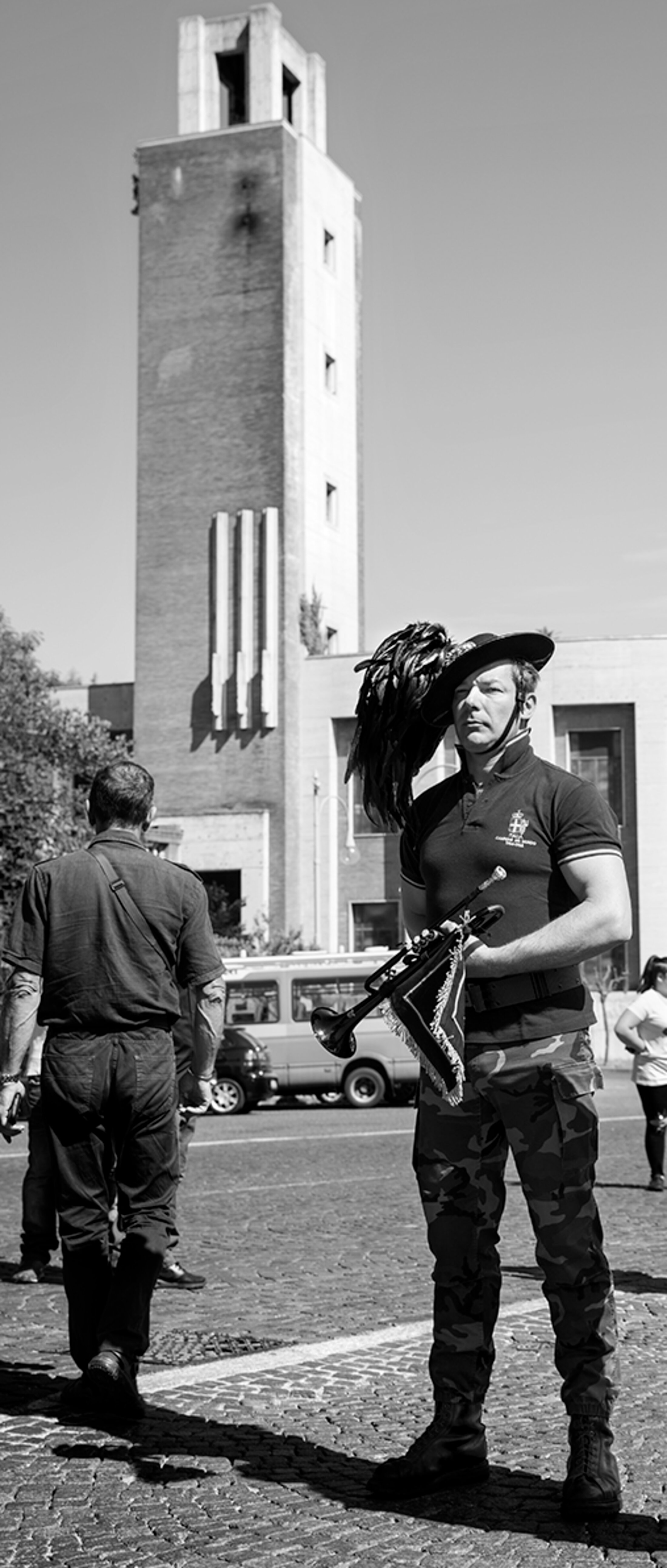 Arrivés au cimetière, les fascistes se mettent au garde à vous devant la crypte des Mussolini. Un fier trompettiste tout de noir vêtu - même sa trompette est noire - et dégoulinant de sueur sous un soleil implacable entonne Il silenzio, un appel militaire. Les appels « Camerata Mussolini », « PRESENTE ! » retentissent dans le cimetière tandis que se lève une forêt de saluts nazis. Un camerata lit une mielleuse Prière au Duce, puis l’un des organisateurs lit un bref discours qui tourne autour du souvenir d’une photo prise aux États-Unis pendant la Grande Dépression, et où l’on voit de longues files d’attente pour acheter du pain, tandis que « dans les mêmes années en Italie on ne manquait ni de pain ni de travail et l’Italie était alors un grand pays connu et respecté de tout le monde, grâce au Duce, pas comme aujourd’hui ». S’ils ne me faisaient pas peur, j’aurais presque de la tendresse pour certains, avec leur air perdu, ingénu, pathétique, parlant de Mussolini comme d’un bon père de famille, compréhensif et généreux, qui prenait soin des Italiens.