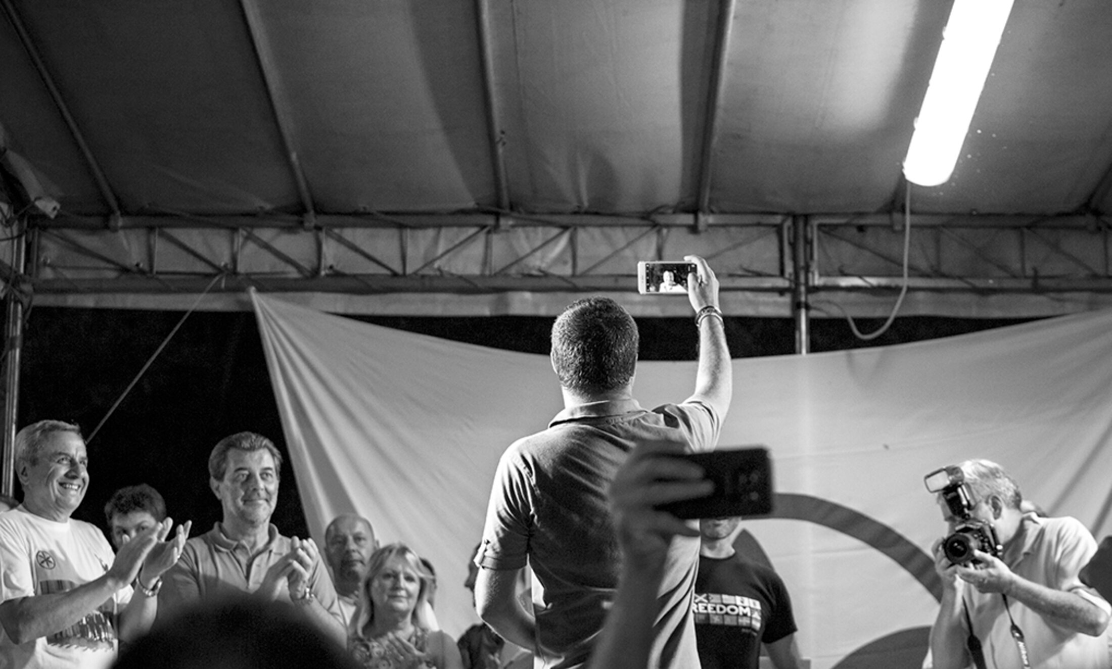 Après les politiciens locaux parle Matteo Salvini, alors seulement jeune leader de la Ligue. Il n’a rien d’original par rapport aux Le Pen, Orbán, Kurz : comme eux il sait construire un discours simple et attrayant, agressif et violent d’une part, plus posé, sérieux et généreux de l’autre, selon son interlocuteur. Un pur opportuniste pyromane qui exploite la colère et le besoin de trouver les coupables du déclin et de l’appauvrissement de la classe moyenne. Ce soir il commence ainsi : « Je ne sais pas ce qui me dérange le plus, les moustiques ou les communistes. De toute façon on va les éliminer tous les deux. Pacifiquement, dans les urnes, j’entends ». Et il continue en parlant de l’invasion qu’il faut bloquer, des Africains violeurs qu’il faudrait « renvoyer chez eux, mais avant une bonne castration chimique ne ferait pas de mal ». La foule applaudit et acclame, tous prennent des photos avec leur portable. Puis Salvini descend dans la foule pour les selfies.