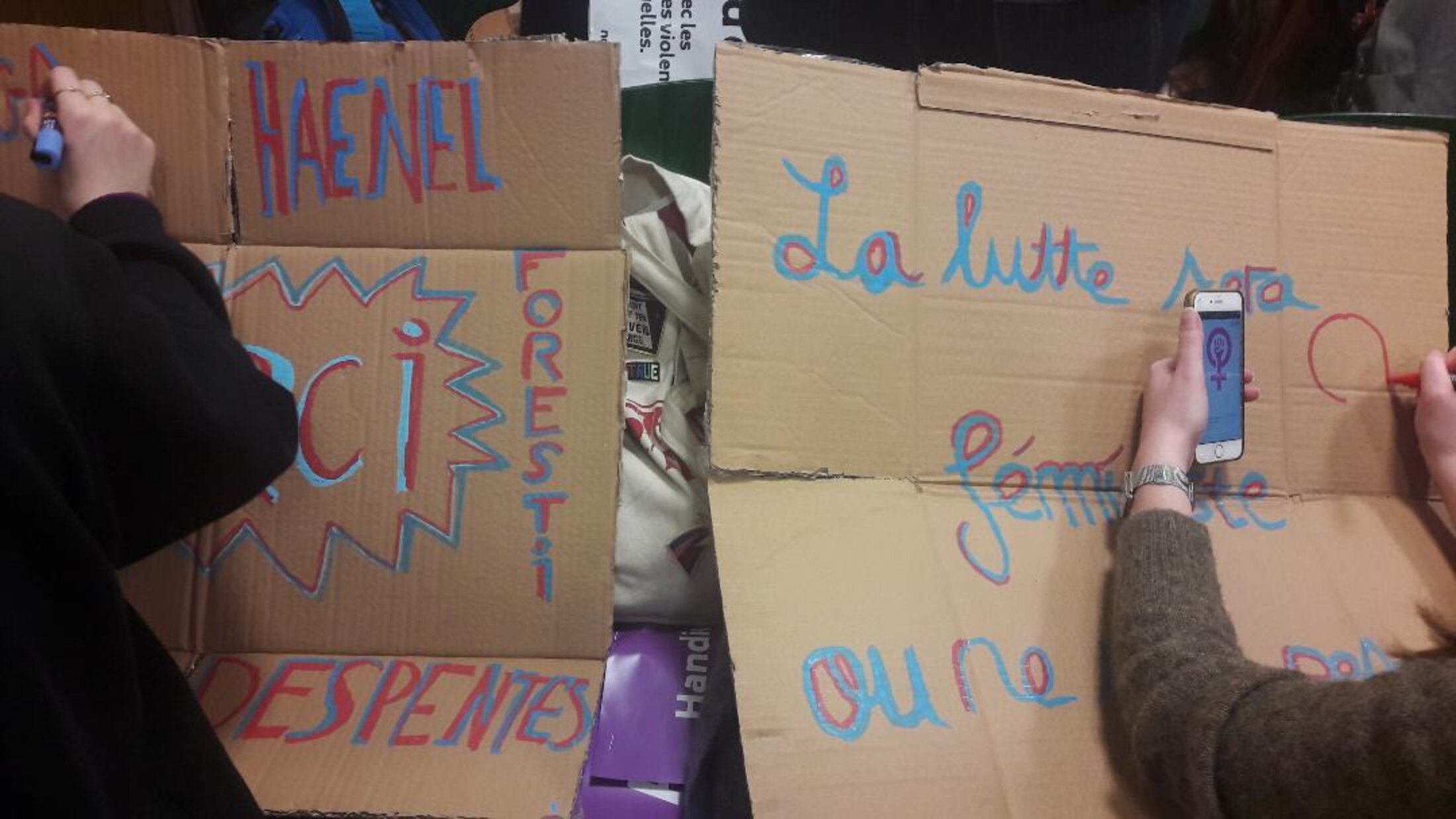 Deux contributrices souriantes s'appliquent à dessiner leurs slogans de soutien aux actrices et auteures qui ont protesté contre le césar de Polanski et dans le prolongement développent la sororité à l'intérieur de la lutte féminine et sociale.