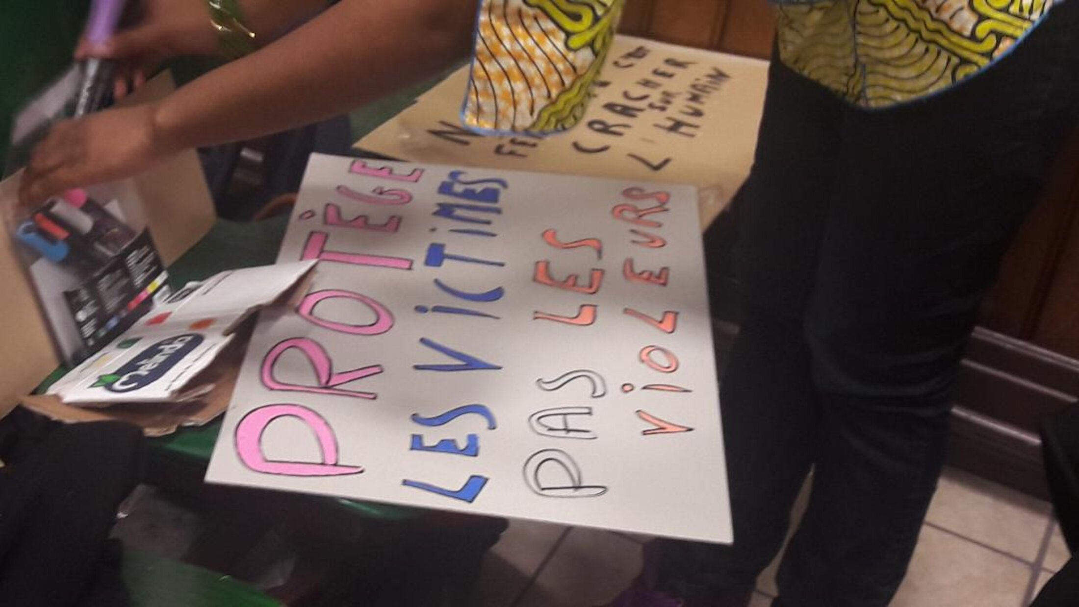 Cette contributrice est très impliquée depuis 20h, appliquée à écrire avec un graphique coloré sa pancarte pour dénoncer un archaïsmes dans notre société: Protéger les victimes pas les violeurs.
