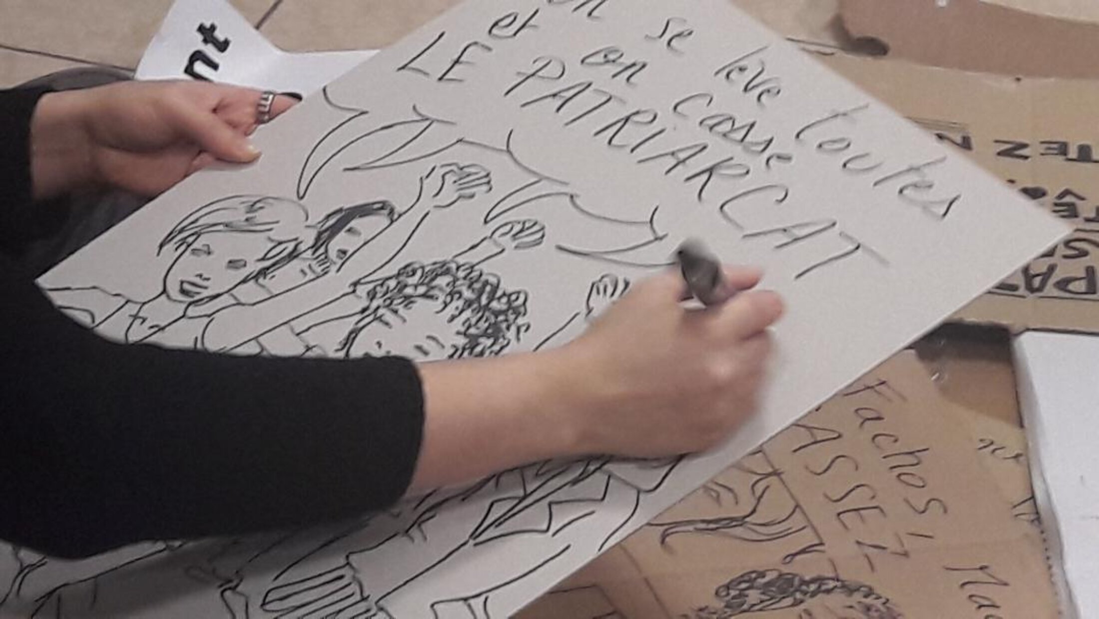Cette contributrice féministe est une dessinatrice incroyablement habile et d'une grande dextérité, elle a réalisé plusieurs pancartes en rapport avec la cérémonies des Césars, une passion qui n'est pas encore son métier mais cela ne saurait tarder. Assise au milieu des autres femmes, sur le carrelage de la salle Eugène Varlin, la Bourse du Travail ressemble à un atelier d'artistes en ébullition créative; depuis le début de la soirée cette dessinatrice enchaîne croquis sur croquis. Ici, un message au patriarcat complaisant et dominateur qui laisse les corruptions perdurer. " On se lève, on se casse ", est un message viral écrit sur une majorité de pancartes ce soir comme une insurrection à cette classe intellectuelle du cinéma français qui à l'instar de l'affaire Matzneff a révélé un microcosme littéraire et une élite culturelle des années 80-90, complaisantes de la pédocriminalité, jusqu'en 2016 avec ce livre faisant l'éloge d'e l'écrivain pervers pédophile. En préparation de la journée internationale des droits des femmes et dans le prolongement du mouvement #me too, la parole des femmes s'est libérée sur des comportements masculin abjectes que la sororité des femmes dénonce. Adèle Haenel, Vanessa Spingora se servent de leur notoriété pour dénoncer une pratique confortée par une certaine conception du patriarcat qui consiste à laisser croire aux adolescentes que l'homme par ses attributs sexuels à ce pouvoir, ce droit de cuissage, de faire la femme. Cette conception dominatrice de l'homme sur la femme est à cet égard révélatrice d'abus sexuels dont ont payé ses femmes et combien d'autres, qui passent à l'âge désirable dans une société hiérarchisée par un patriarcat dominateur.