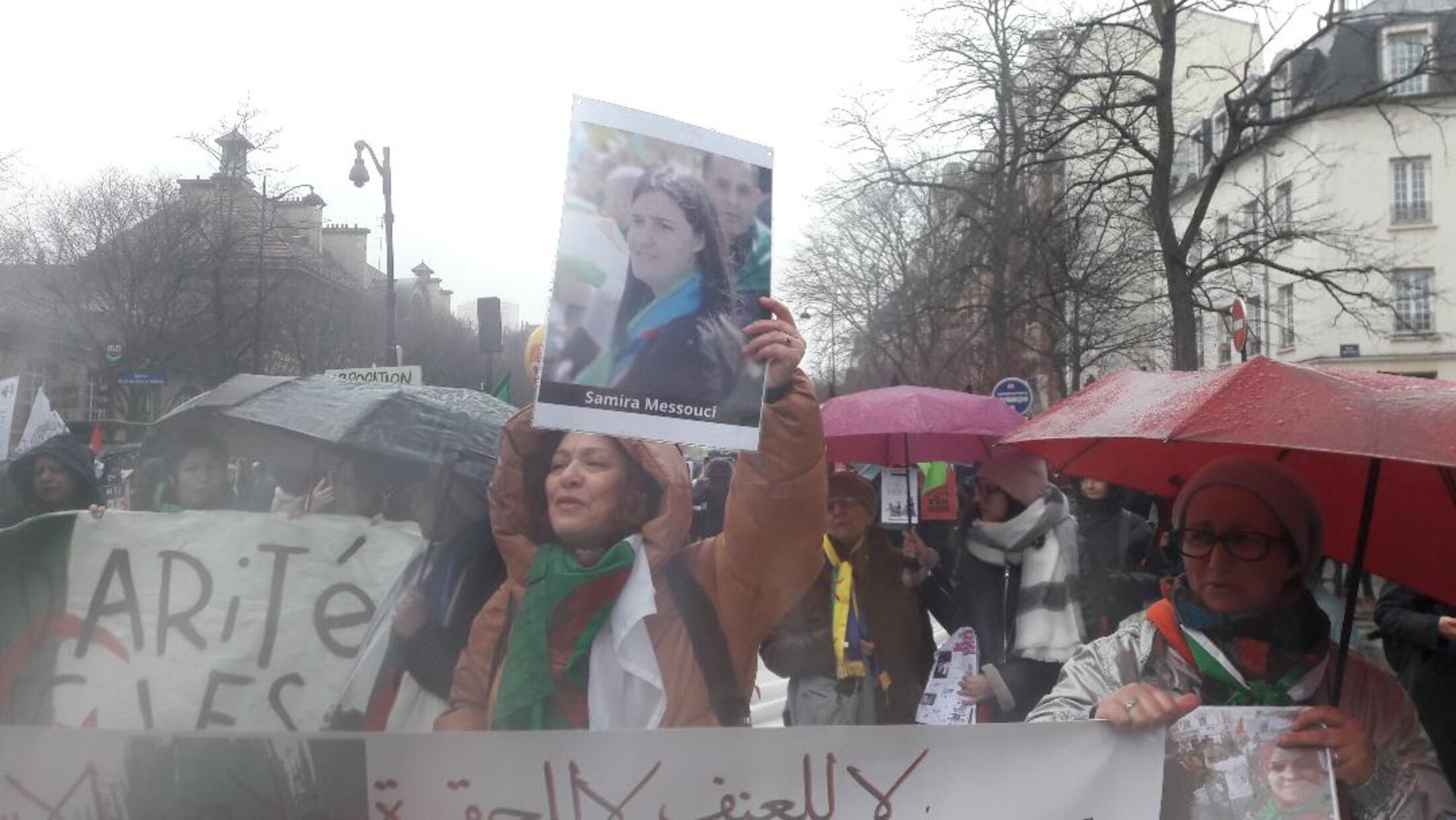 Hirak. Femmes algériennes en lutte pour dénoncer les arrestations arbitraires du pouvoir algérien. Ce mouvement de contestation populaire contre le régime politique de corruption est fortement réprimé par l'Etat algérien. Des femmes algériennes contestataires du pouvoir sont encore incarcérées. Ici, Samira Messouci qui vient d'être libérée de plus de 5 mois de prison en Algérie.