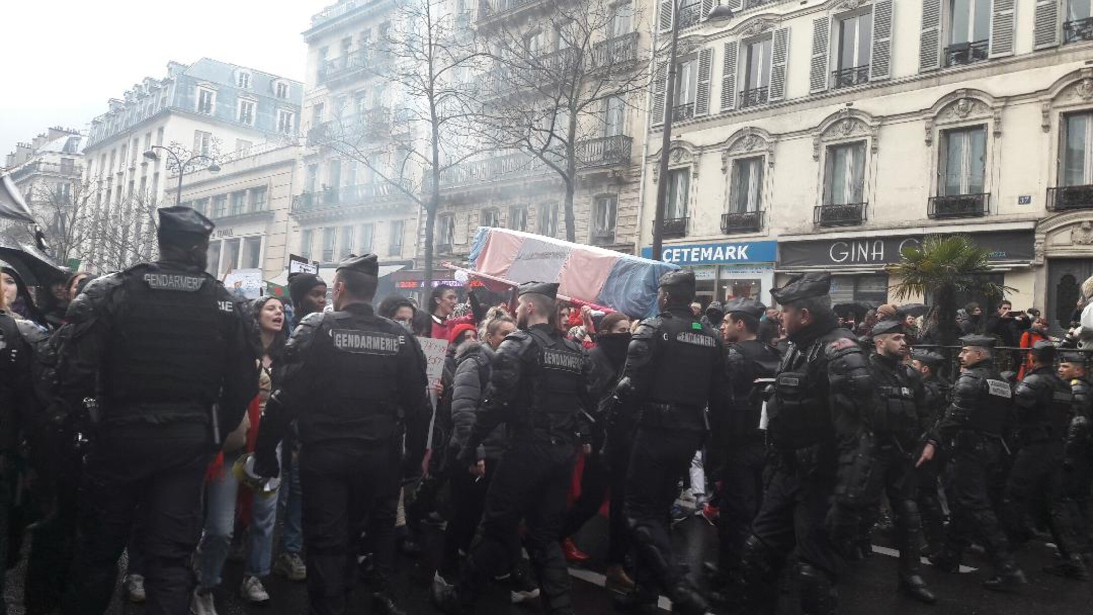 La gendarmerie ceinture les premières manifestantes et manifestants sur le boulevard du Temple. Puis, à droite va se dérouler une scène de rixe provoquée par la présence des factions fascistes. Les gendarmes ont laissé les factions d'extrême droite filer interpellant avec brutalité des manifestantes anti-fasciste. Une grenade de desencerclement a été lancé. Le samedi précédent, la manifestation du 8 mars, une marche féministe nocturne déclarée a été réprimé par les FDO. Les CRS et les gendarmes ont déployé une dizaine de camions autour de la place de la République pour bloquer certaines rues adjacentes. Les manifestantes voyant vers 21H30 approcher les FDO en direction de la place de la République où elles étaient réunies sans incident, un mouvement général les a entraîné vers la rue faubourg du Temple en direction du canal St Martin, scandant " tous le monde déteste la police " bloquées par les FDO. Des chants anti-fascistes, et des slogans contre les violences policières de centaine de manifestantes ont résonné devant un cordon de FDO droit dans ses bottes. Une manif sauvage a suivi mais la gendarmerie a réussi facilement à leur barrer la route.Vers 22h30, un groupe d'une vingtaine de voltigeurs à moto se sont déployés empruntant le canal St Martin en direction de République. La tension est montée pour traquer les manifestantes dans le quartier qui ont fini par subir des coups de matraques et ont été gazé et forcer avec violence à rejoindre le métro République.