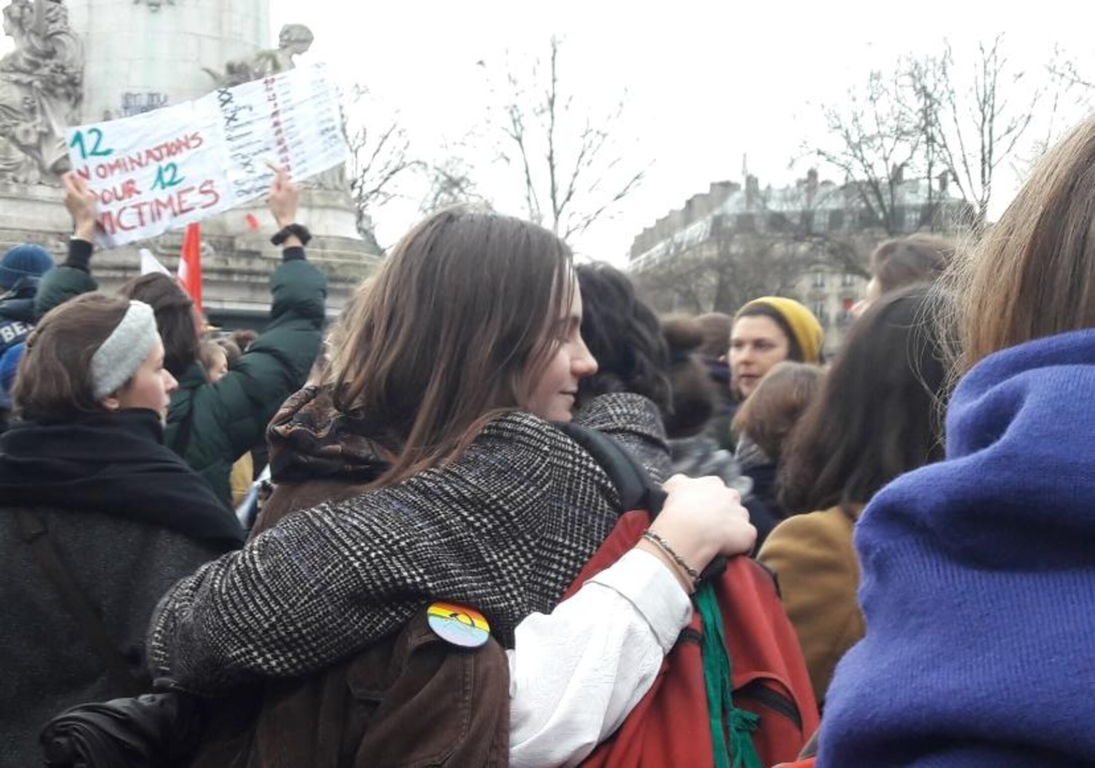 Place de la République arrivée des cortèges de la manifestation du 8 mars. Un rassemblement sur la place de la République emmené par le char des Rosie a réuni les manifestantes et les manifestants retrouvant le sens festif de cette manifestation après les tensions de gendarmerie sur les manifestantes anti-fasciste dans l'après-midi. Après une minute de protestation demandée par les Rosies pour scander " On se lève, on se casse, on vous emmerde ", les manifestantes ont fustigé le gratin du cinéma français en leur adressant ces mots devenus viral. Mais un élan d'amour donne un sens particulièrement touchant à ce moment: ce couple de manifestants tombé dans les bras mutuellement. Une minute plus tôt, la foule s'indignait de honte sur le " Violanski ".