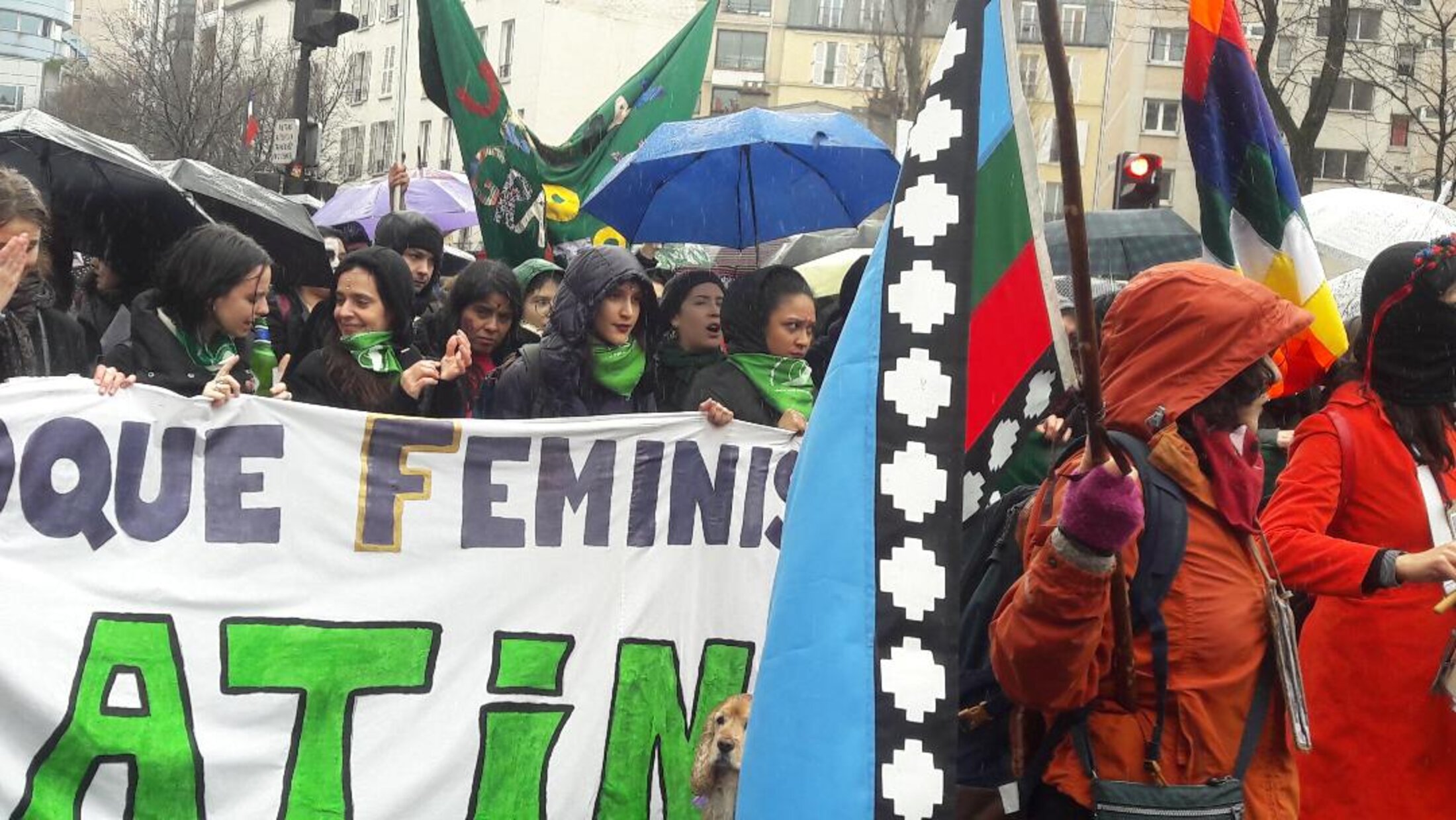 Alliance des femmes d'Amérique Latine, très fort engagement dans ce cortège en lutte contre le sexisme et les violences contre les femmes: " cocinar, lavar, y tambien trabajar " , " notre corps n'est pas un butin de guerre ". On chante on danse et les drapeaux se hissent haut en couleur.