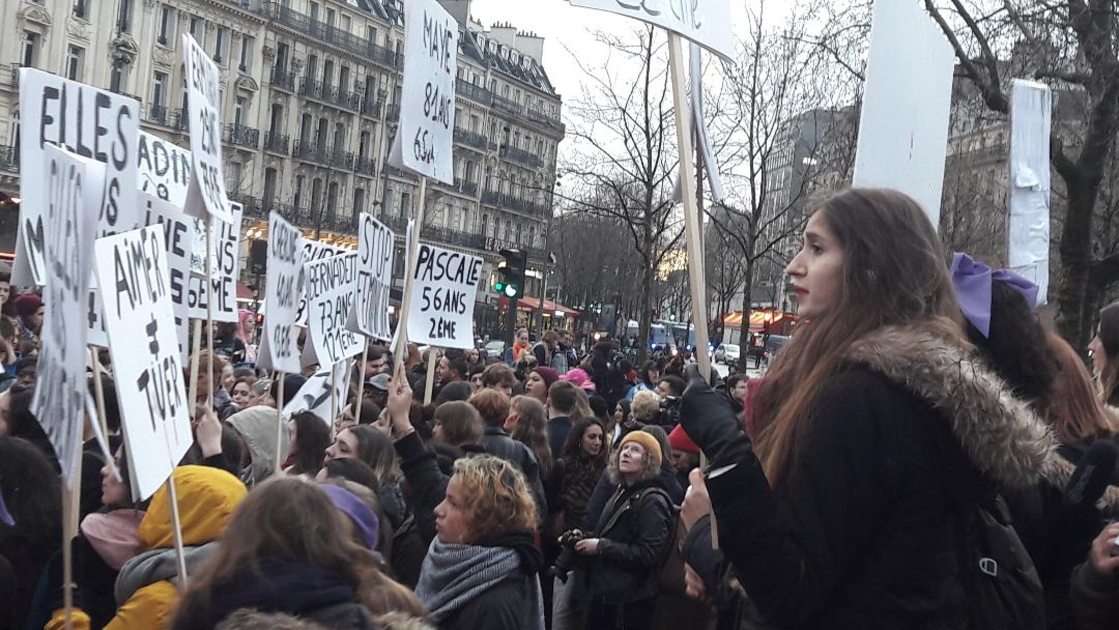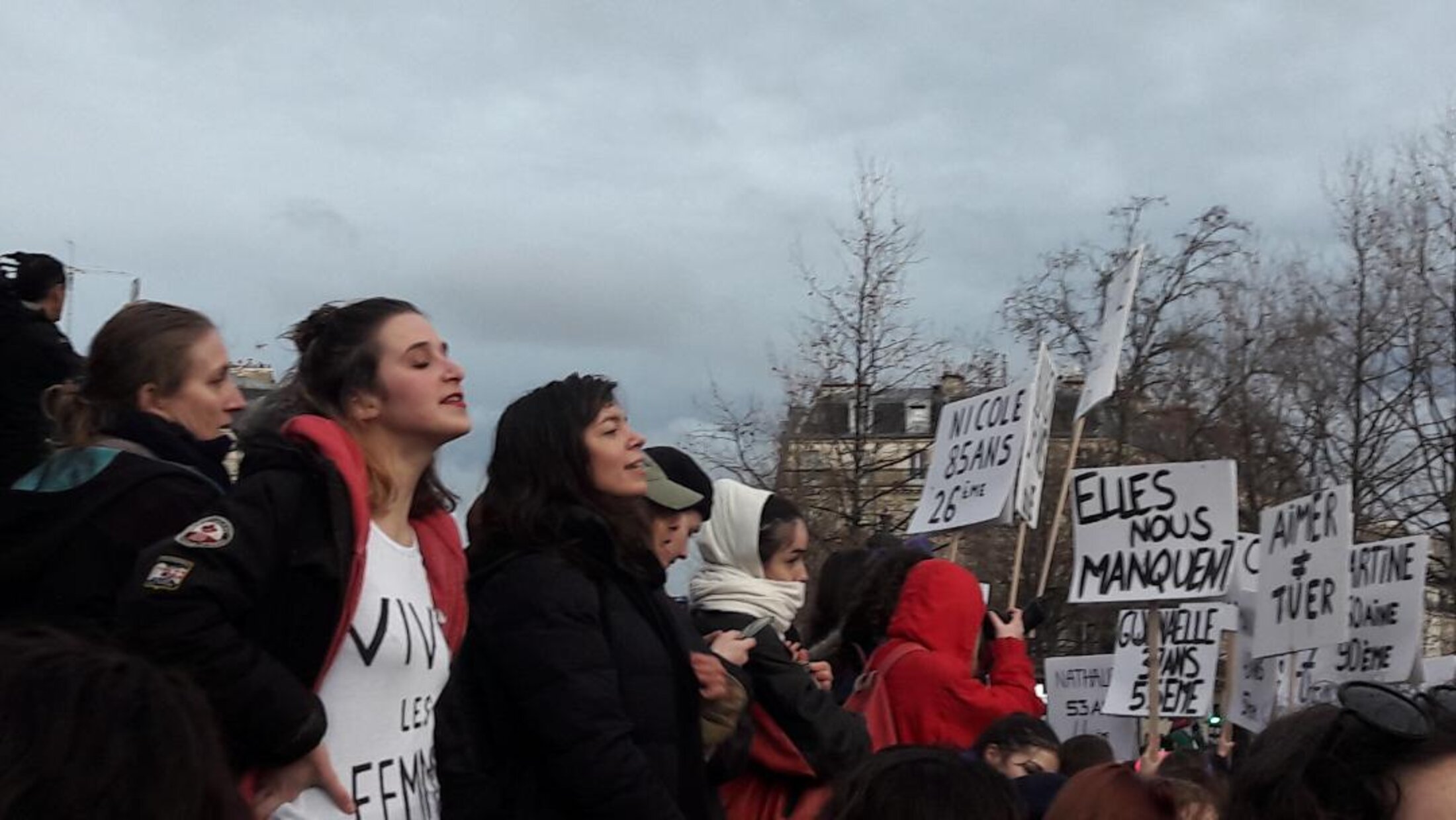 "Solidarité avec les femmes du monde entier "; chant émouvant au milieu de cet hommage rendu aux femmes de l'hexagone victime de féminicide; suivi de l'hymne des Gilets Jaunes en convergence de lutte des grévistes contre la loi de retraites par points " On est là, on est là même si Macron le veut pas nous on est là... "