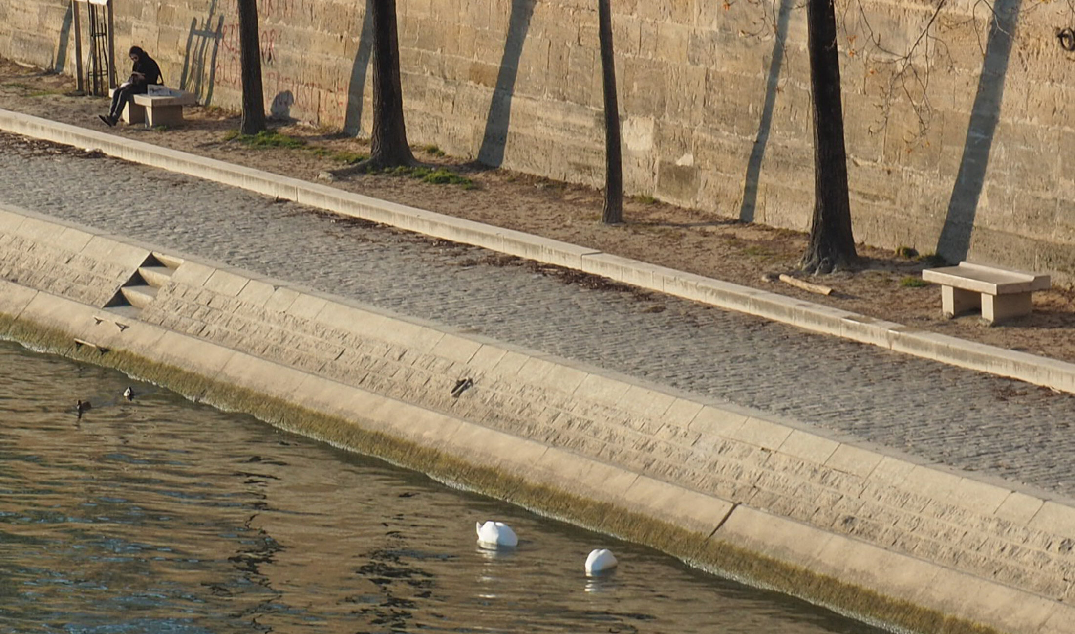 Une lectrice solitaire, au soleil d'avril 2020, vers 20h. Même les cygnes se refusent à voir cela.