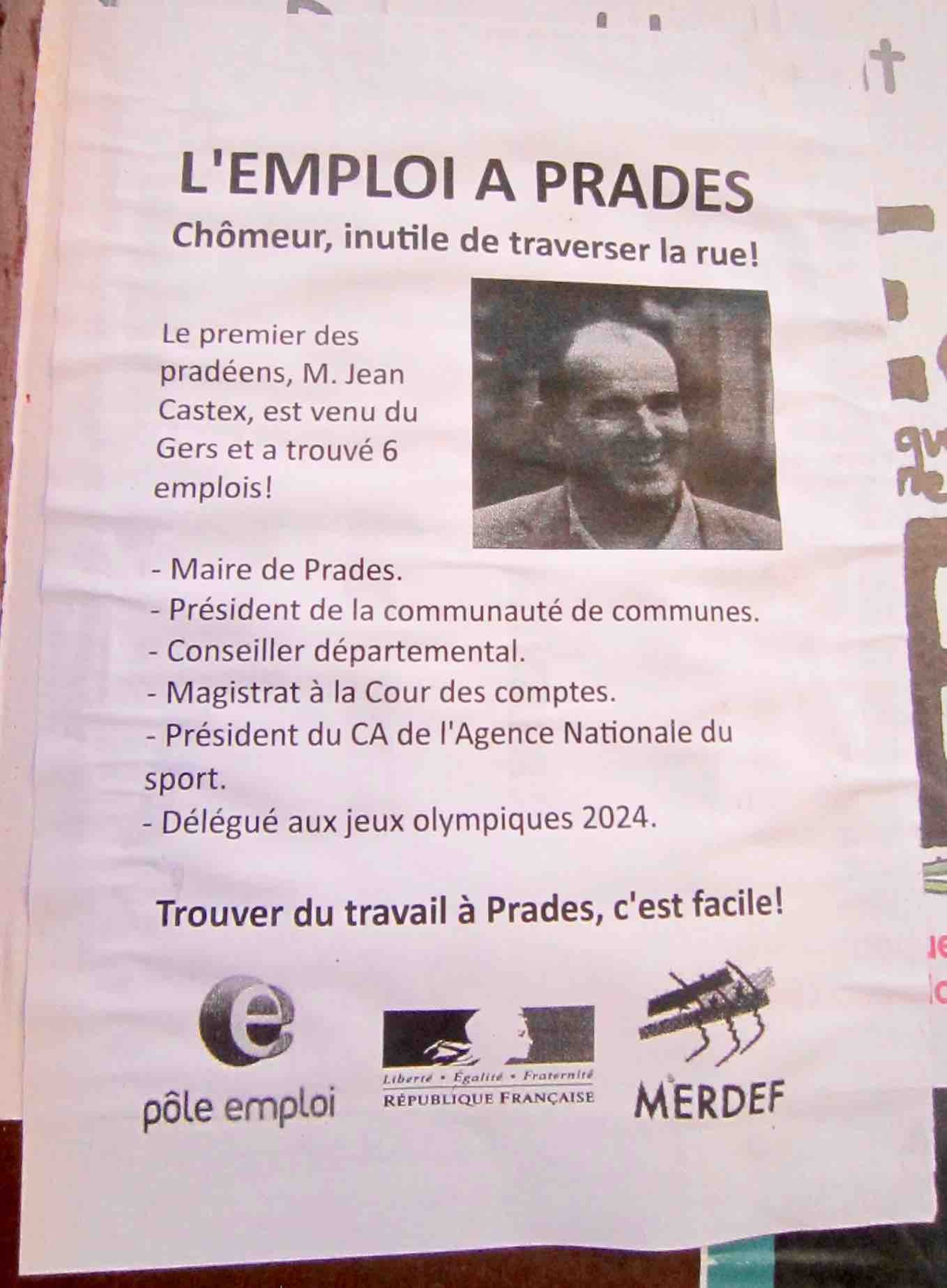 Selon des affiches vues dans Prades, ville des Pyrénées Orientales dont Jean Castex est maire, président de la communauté de communes, conseiller départemental, etc... Jean Castex avait 6 emplois avant la pandémie gérée de façon dramatique par le gouvernement français.