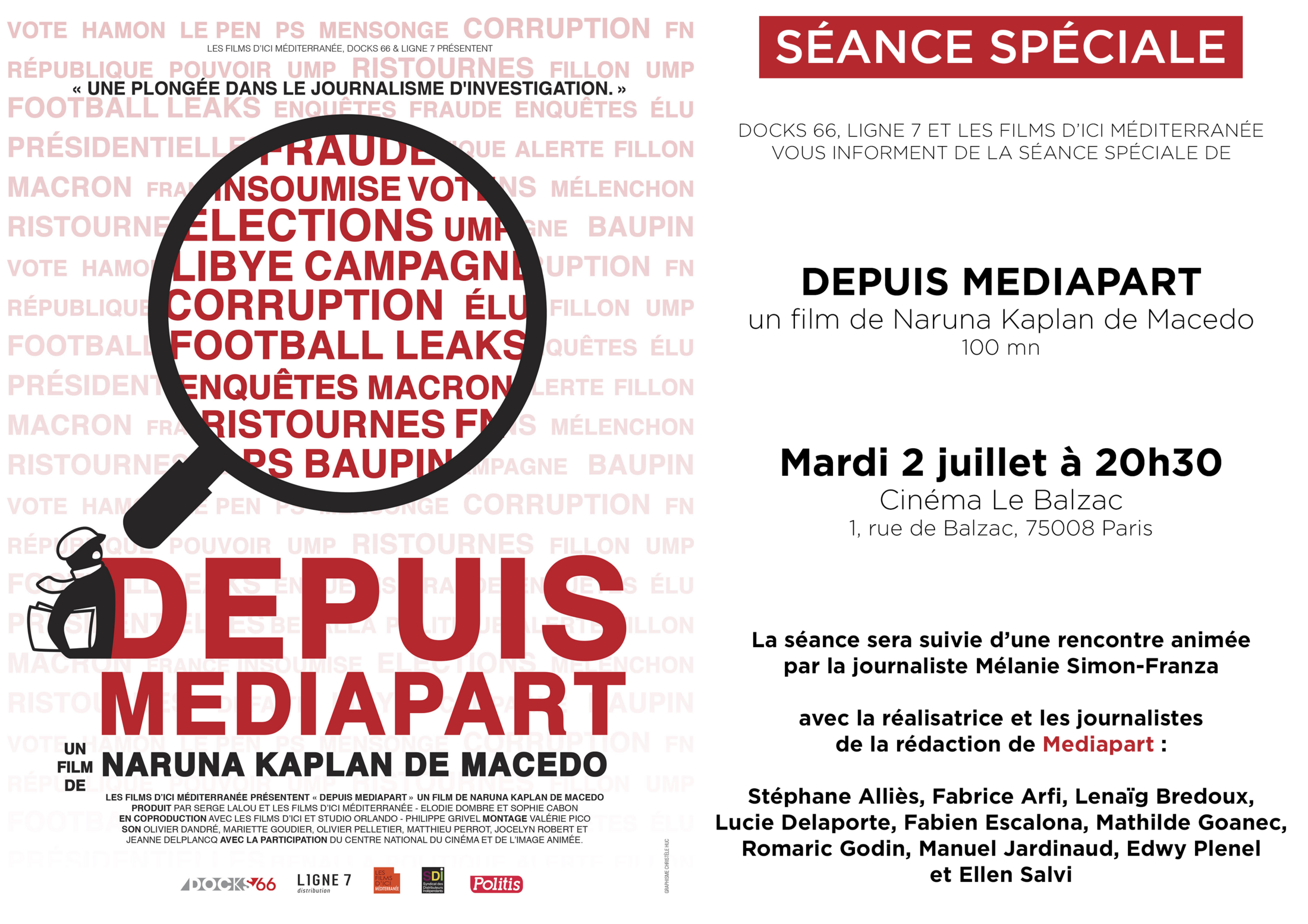 Projection de Depuis Mediapart suivie d'une rencontre avec la réalisatrice Naruna Kaplan de Macedo et les journalistes de la rédaction de Mediapart : Stéphane Alliès, Fabrice Arfi, Lenaïg Bredoux, Lucie Delaporte, Fabien Escalona, Mathilde Goanec, Romaric Godin, Manuel Jardinaud, Edwy Plenel et Ellen Salvi. Mardi 2 juillet, à 20h30, au cinéma Le Balzac
