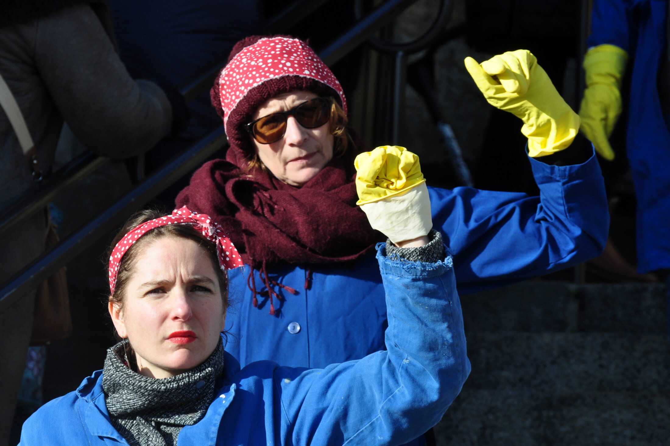 Pour le costume : bleu de travail, ruban à pois rouge dans les cheveux, à l’image de l’icône féministe américaine « Rosie la riveteuse », gants de ménage jaunes pour symboliser la double ou triple journée des femmes (et clin d’oeil aux Gilets de la même couleur !).