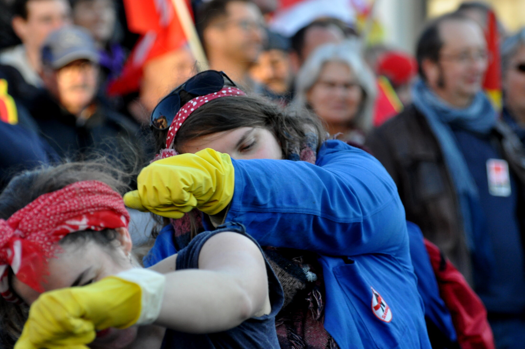 Lundi un groupe de militantes se réunit et apprend la chorégraphie pour les manif de mardi et des jours suivants... Le groupe s'étoffe de jour en jour et danse dans différents lieux de la ville. Ici devant les usines Renault...