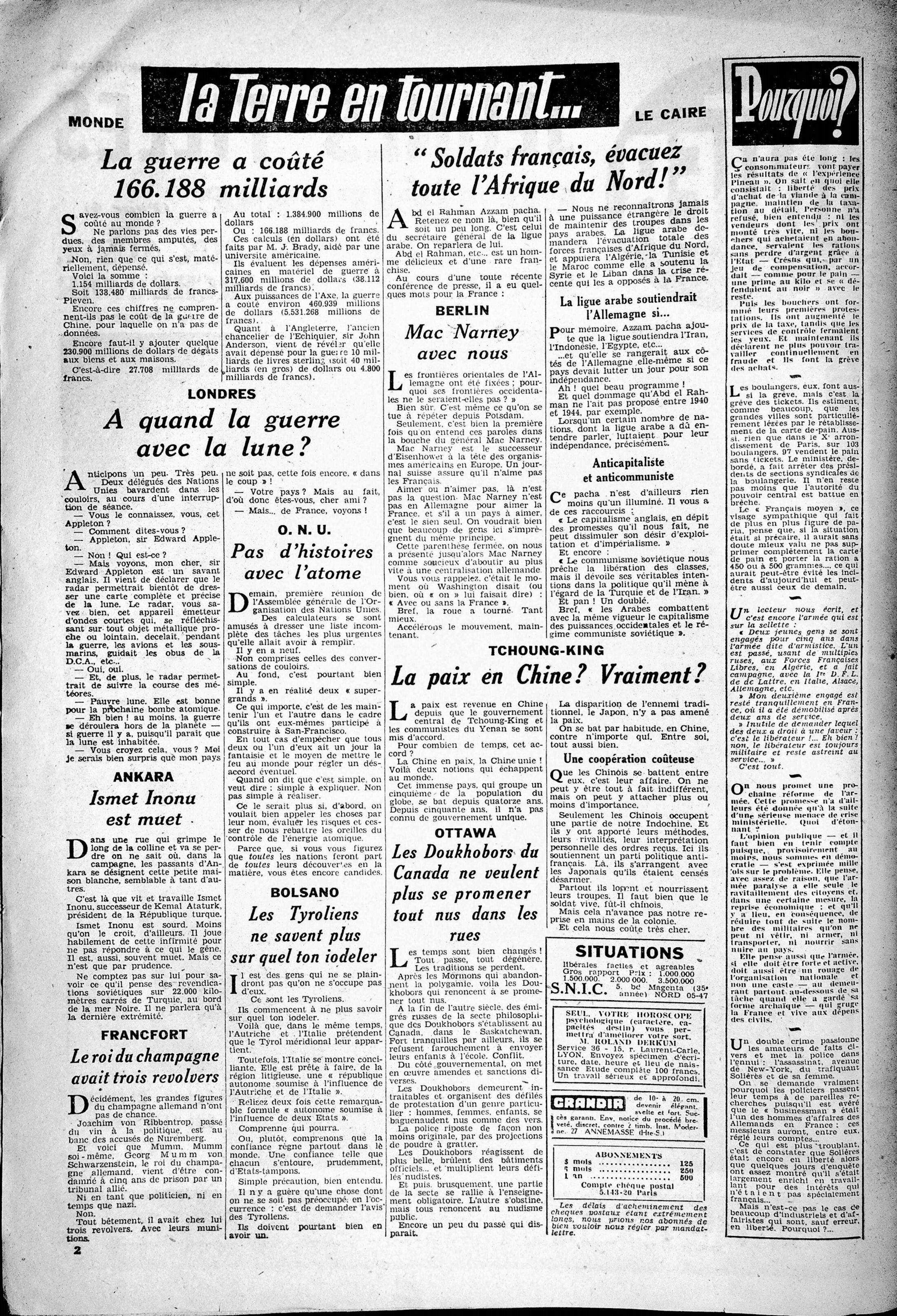 page 2 : "La Terre en tournant" (actualités du monde) / "Pourquoi ?" (analyse satirique de la politique française)