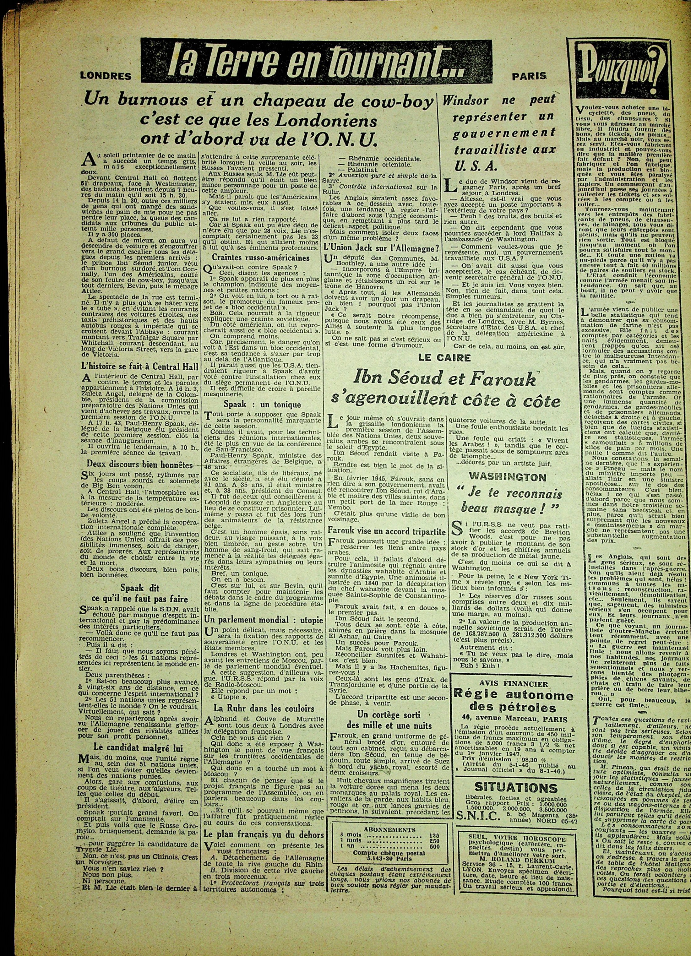 la première session de l’ONU à Londres / rencontre de deux souverains arabes (Ibn SEOUD et FAROUK) /