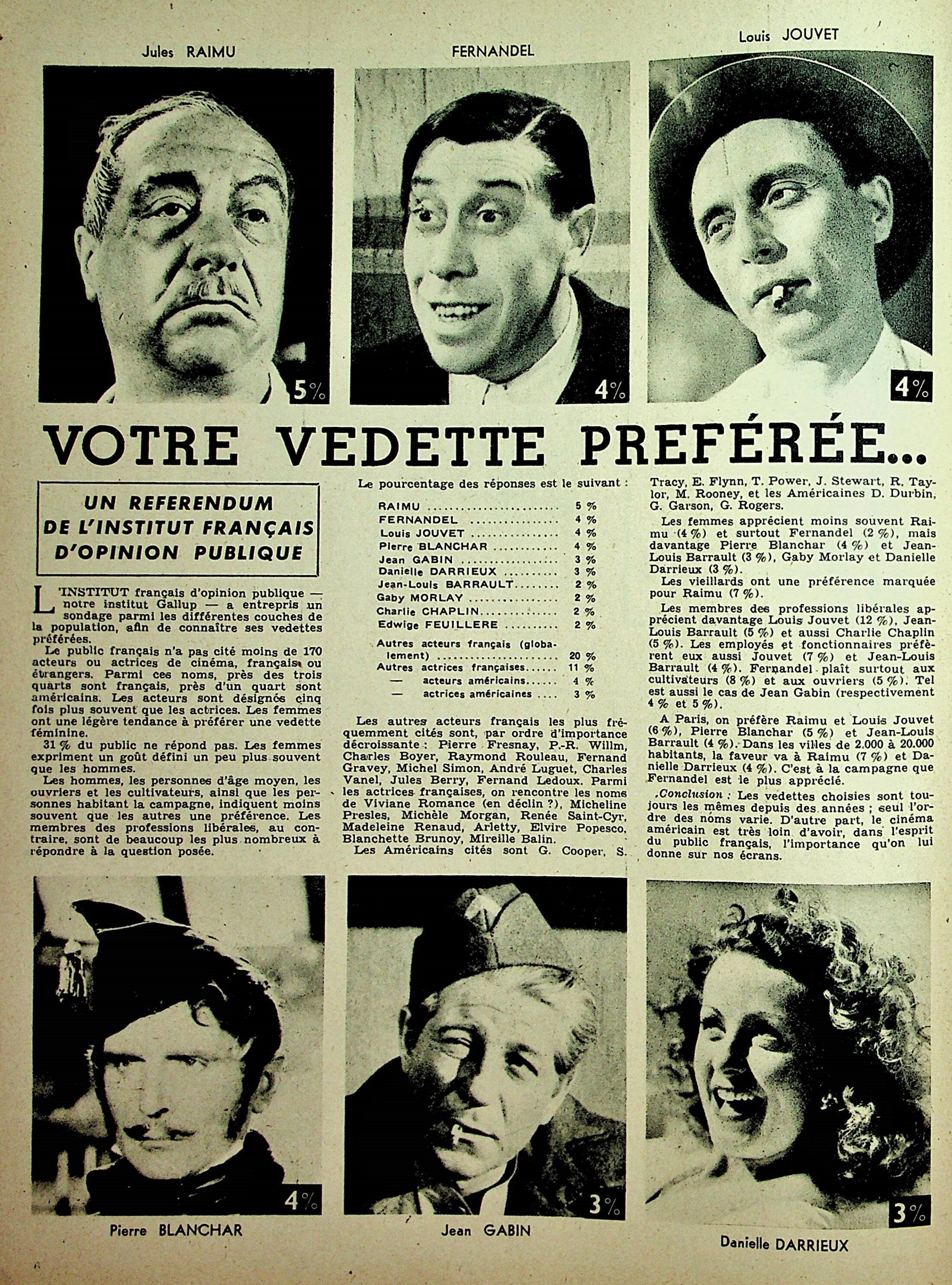viennent en tête chez les hommes : RAIMU/ FERNANDEL/ JOUVET/ Pierre BLANCHARD (moins connu à ce jour, mais vedette importante en 1946 )/ viennent ensuite : GABIN / BARRAULT / CHAPLIN