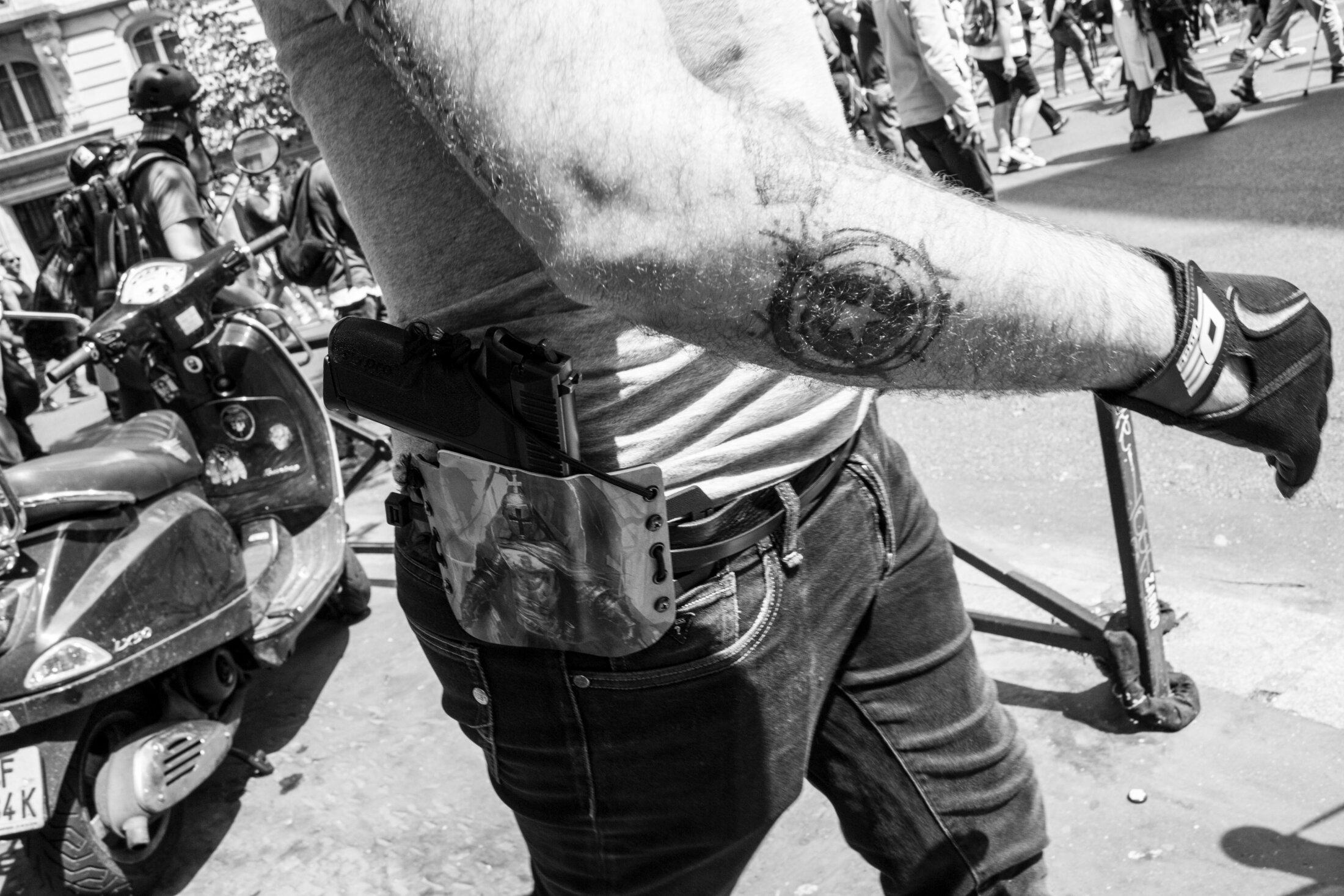 Un gangster? Un templier armé? Non! C’est un agent de la BAC à Paris. C‘est la France qui est devant nos yeux et on la voit à peine. C’est la réalité d’une violence d’exception qui devient quotidienne.
