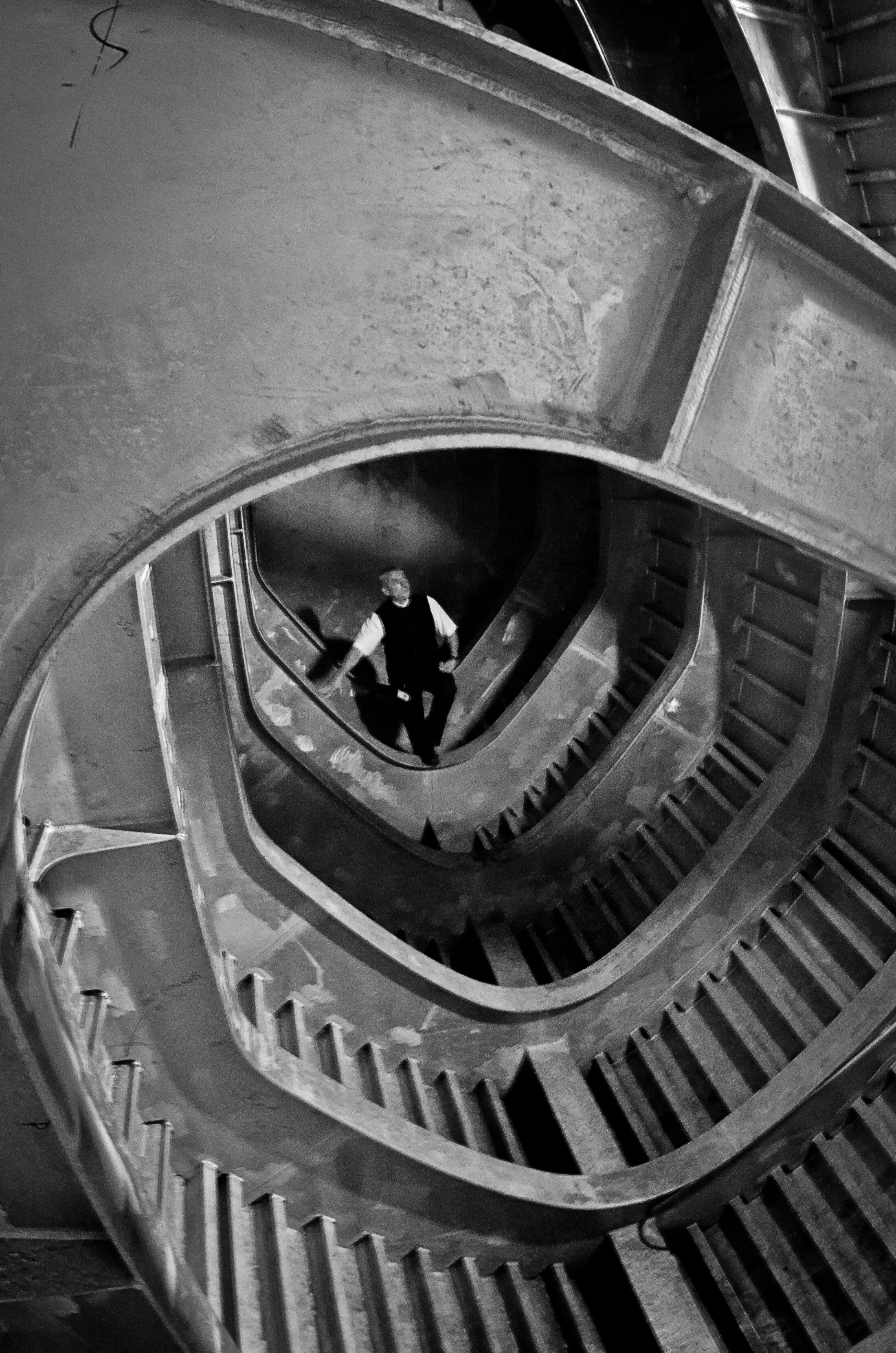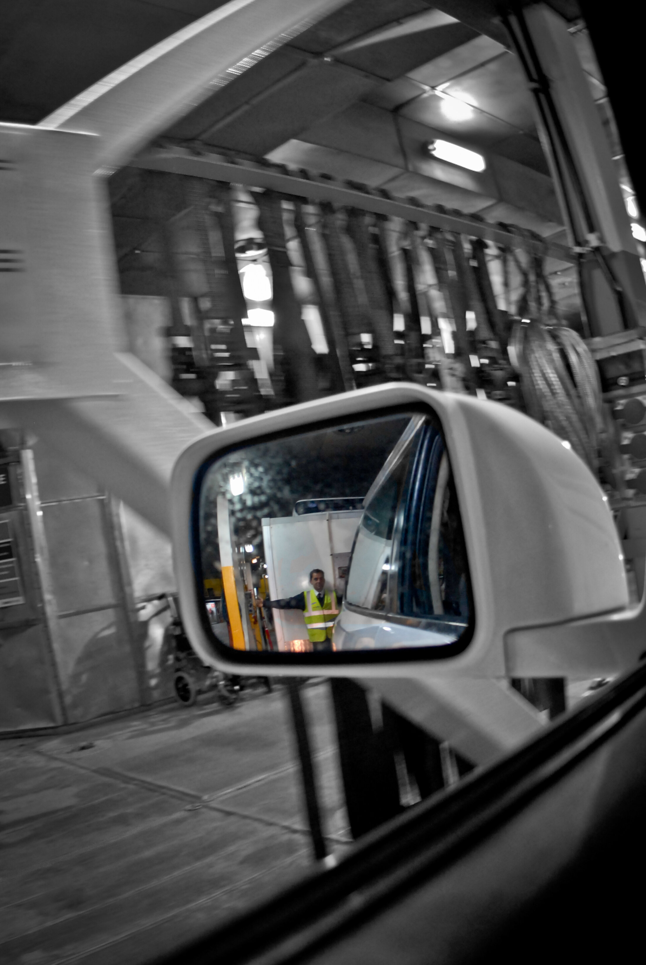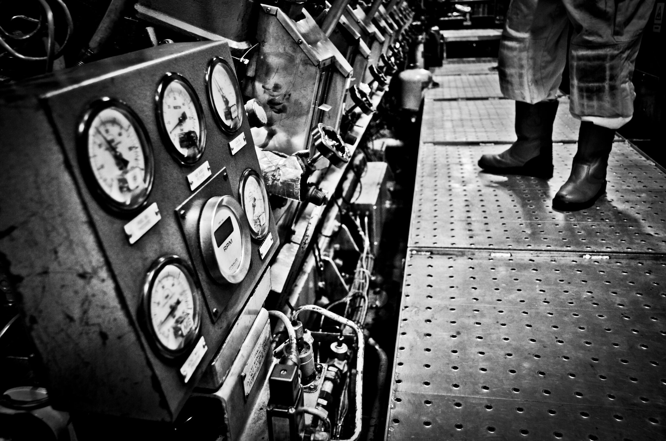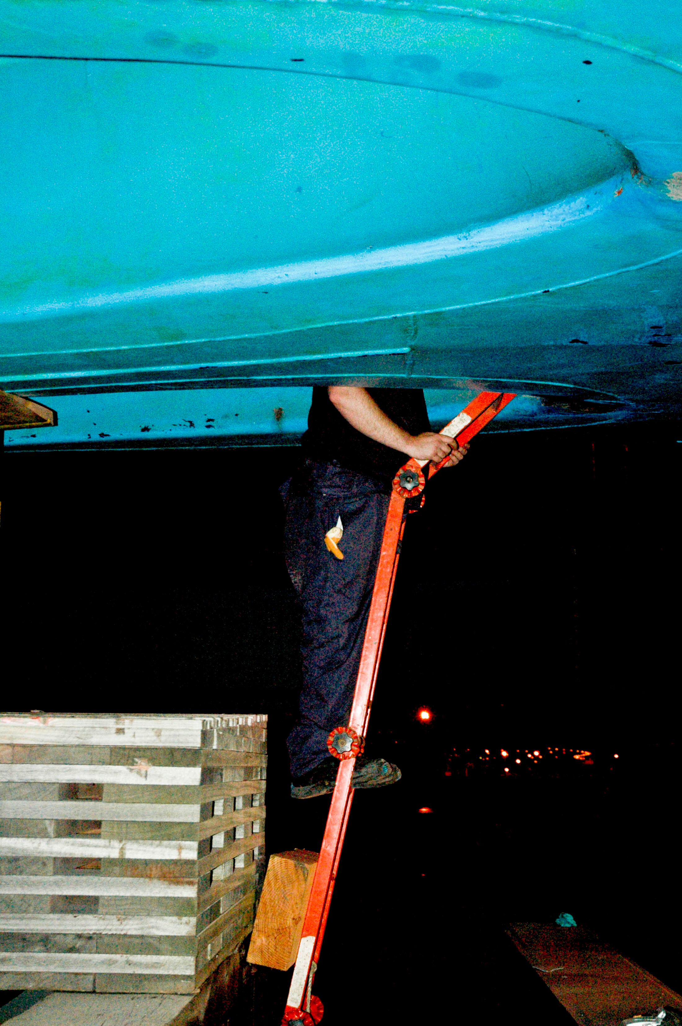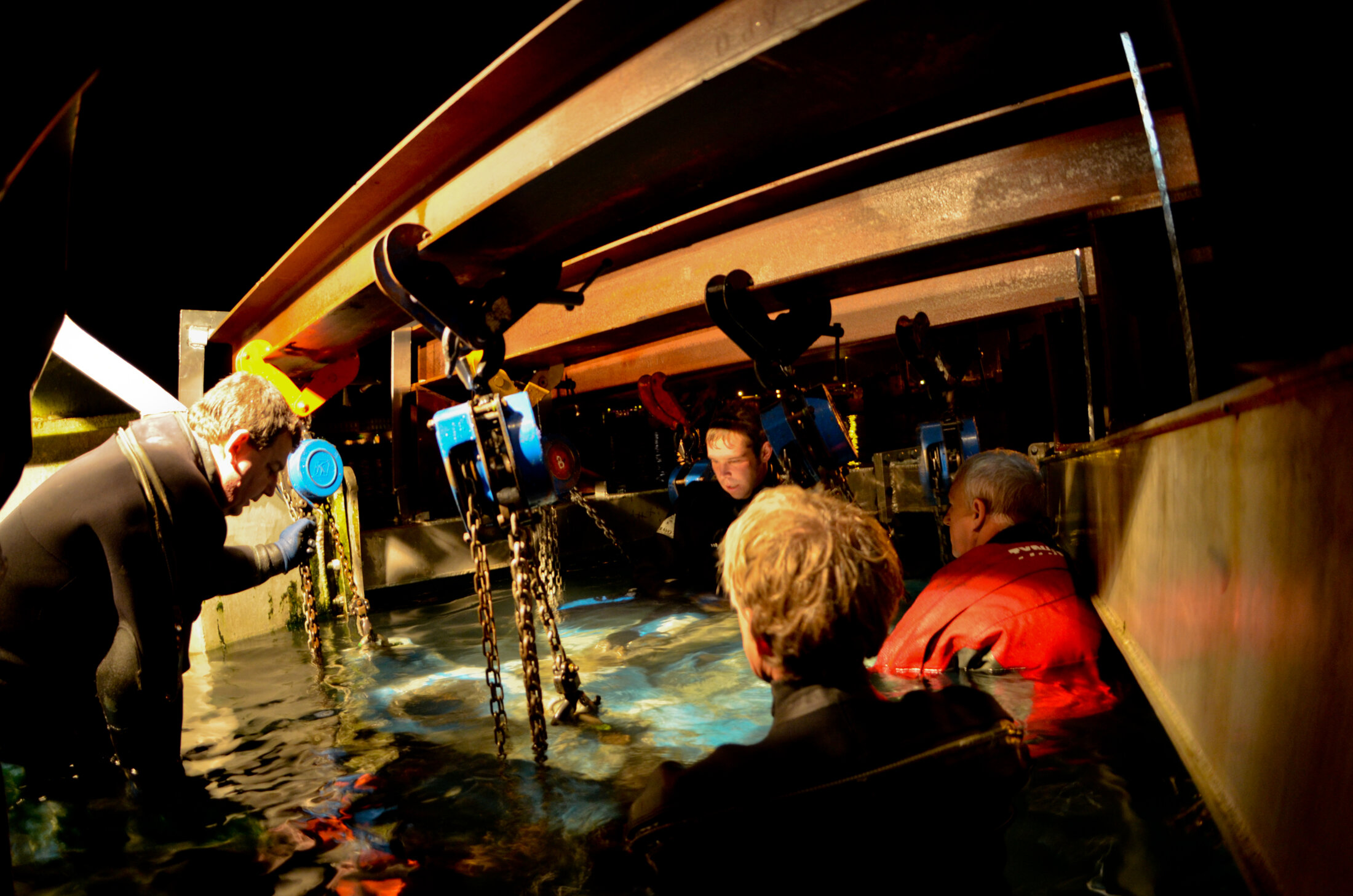 Suite à l'avarie, dont je parlais lus tôt, le navire est en cale sèche à Cherbourg. Ici l'un des mécanos jette un oeil dans le jet, la partie ou l'eau de mer est aspirée.