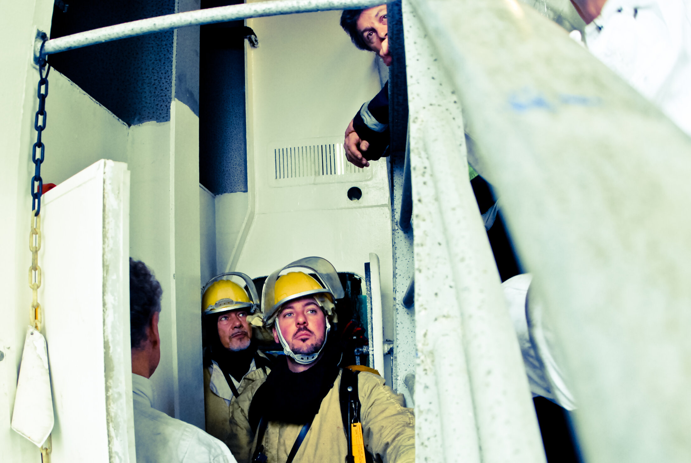 La sécurité sur les navires n'est pas prise à la légère, toutes les semaines l'équipage doit s'entrainer, évacuation, collision, premier secours ou comme ici exercice incendie. La répétition des gestes est d'une importance cruciale lors des quelques incidents qui jalonne la vie des ferries, marins et personnels de cabine doivent travailler main dans la main en coordination par parfaite.