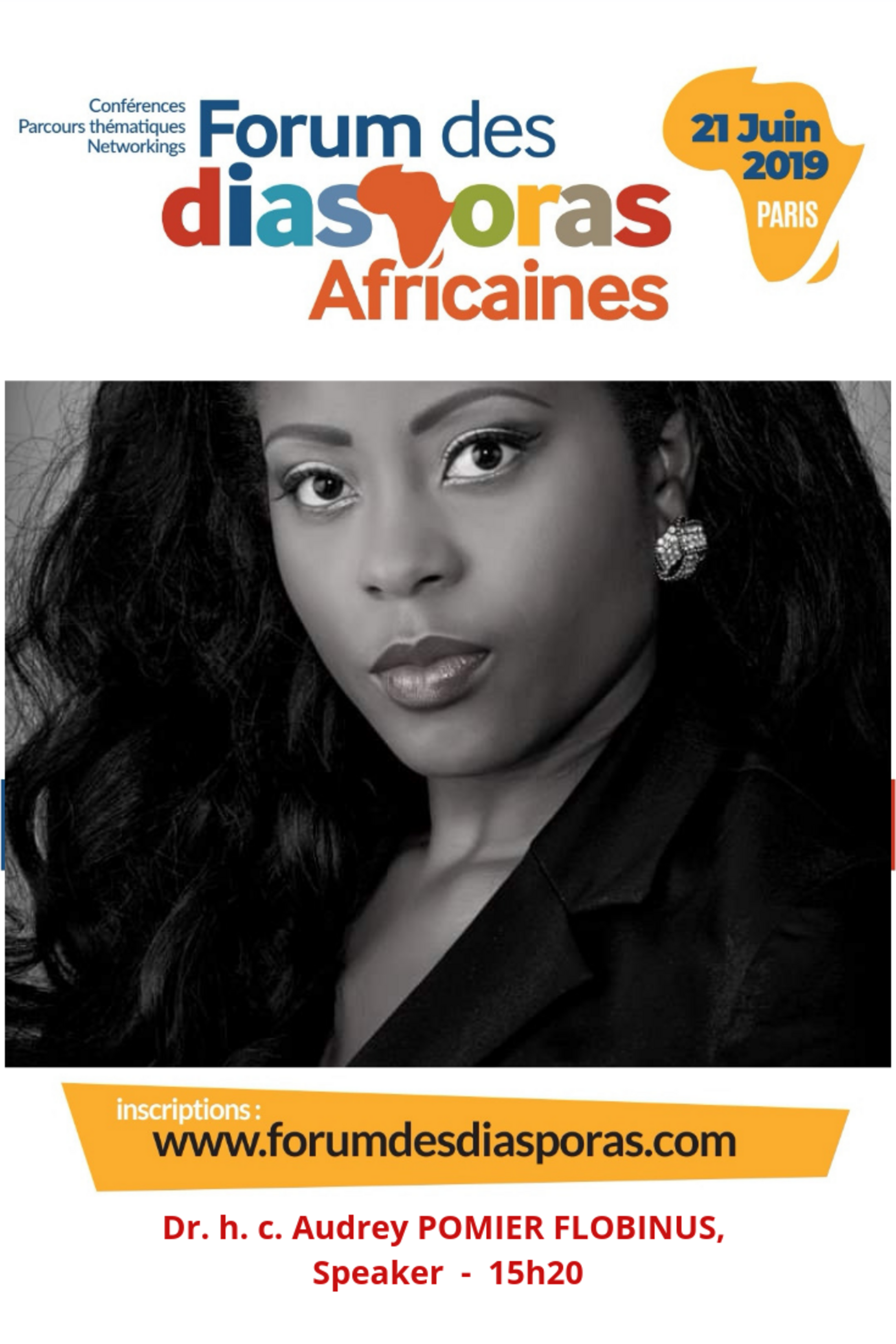 Lors de la deuxième édition du Forum des Diasporas Africaines, qui se tiendra dans le cadre du Beffroi de Montrouge (Centre culturel et de congrès aux portes de Paris) le Dr.h.c Audrey POMIER FLOBINUS, défendra la position de Humanity For The World (HFTW), un lobby humanitaire international français au service d'un développement économique et social durable pour l'Afrique.