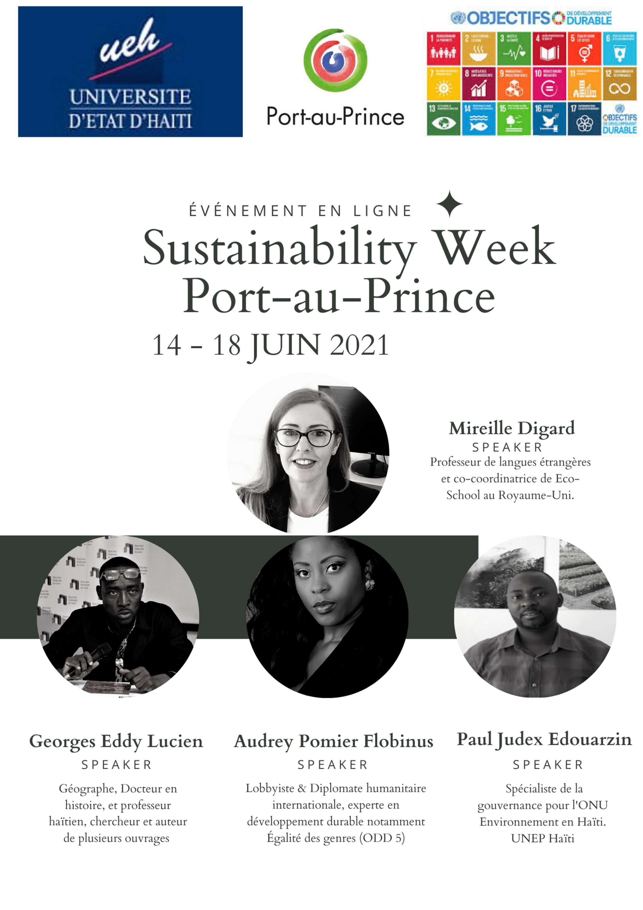 Des intervenants nationaux et internationaux animeront cette semaine du développement durable en Haiti : des personnalités comme Paul Judex Édouarzin (chef du bureau de PNUE à port-au-Prince), Gorges Eddy Lucien (Docteur en urbanisme), des personnalités internationales comme Audrey Pomier Flobinus (CEO de Humanity for the world) et Mireille Digard et autres