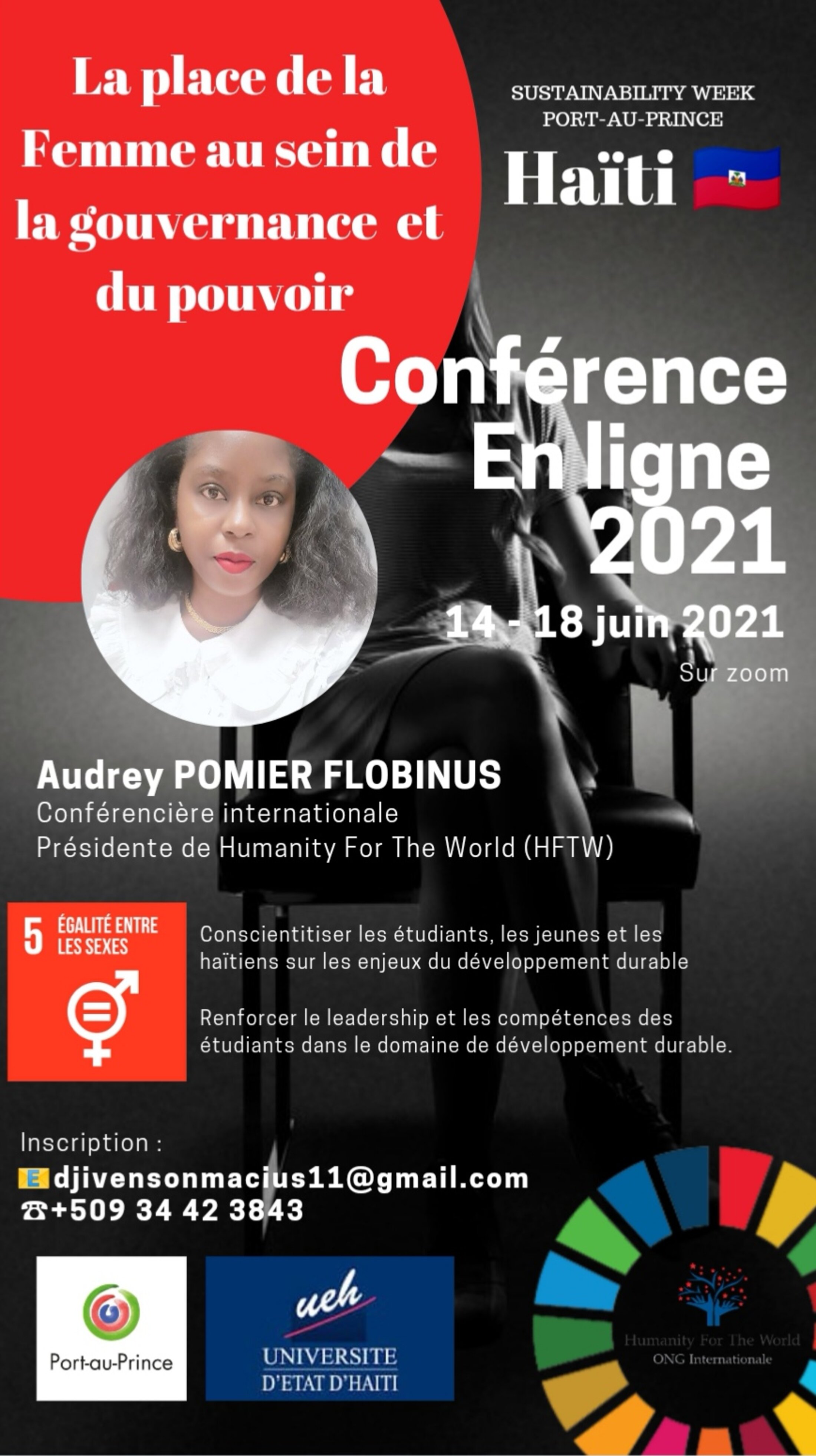 En Haïti, dans le cadre de la semaine de la durabilité organisée par Sustainability Week Port-au-Prince et l'Université d'Etat d'Haïti (UEH), Audrey POMIER FLOBINUS, intervient sur la thématique de l'égalité des sexes : Le pouvoir le la Femme au sein de la Gouvernance et du Pouvoir