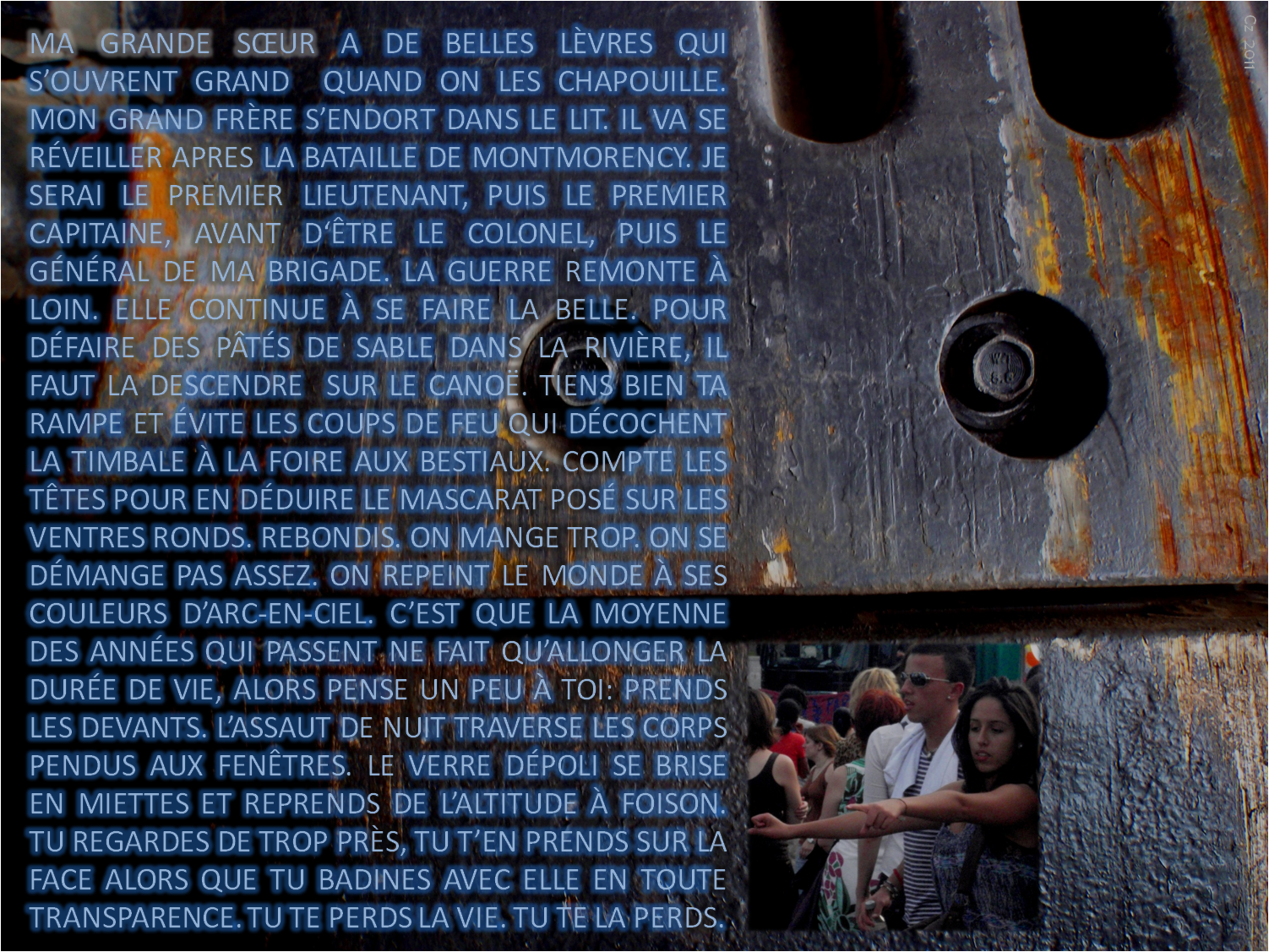 L’assaut de nuit traverse les corps pendus aux fenêtres. Le verre dépoli se brise en miettes et reprends de l’altitude à foison. Tu regardes de trop près, tu t’en prends sur la face alors que tu badines avec elle en toute transparence. Tu te la perds la vie. Tu te la perds.