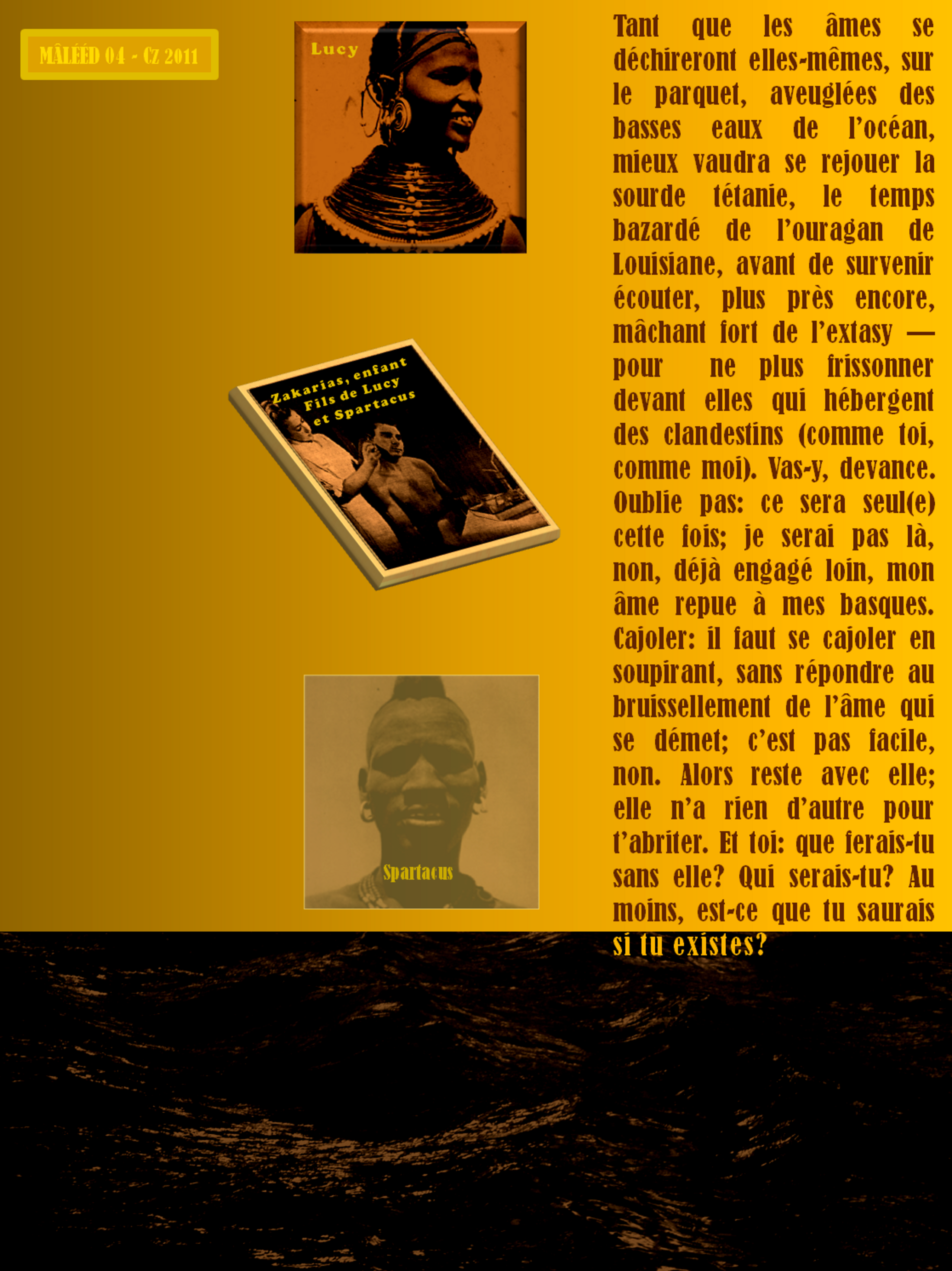 Mon âme repue, à mes basques. Cajoler : il faut se cajoler en soupirant, sans répondre au bruissellement de l'âme qui se démet ; c'est pas facile, non. Alors reste avec elle ; elle n'a rien d'autre pour t'abriter. Et toi, que ferais-tu sans elle? Qui serais-tu ? Au moins, est-ce que tu saurais si tu existes?