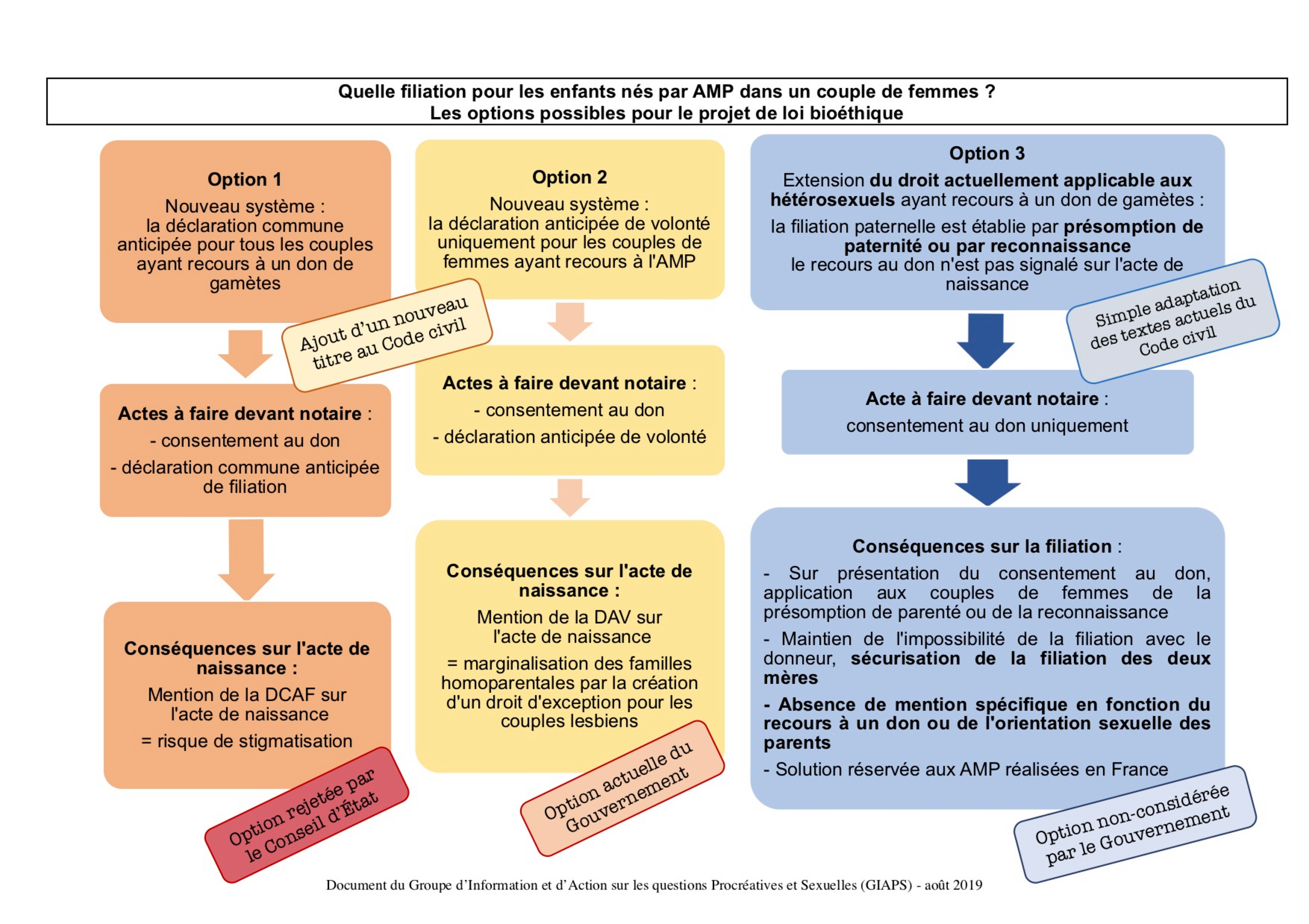 Ce schéma résume rapidement les différentes options discutées afin de permettre d'établir, dès la naissance, la filiation de deux femmes ayant eu recours à une assistance médicale à la procréation en France.