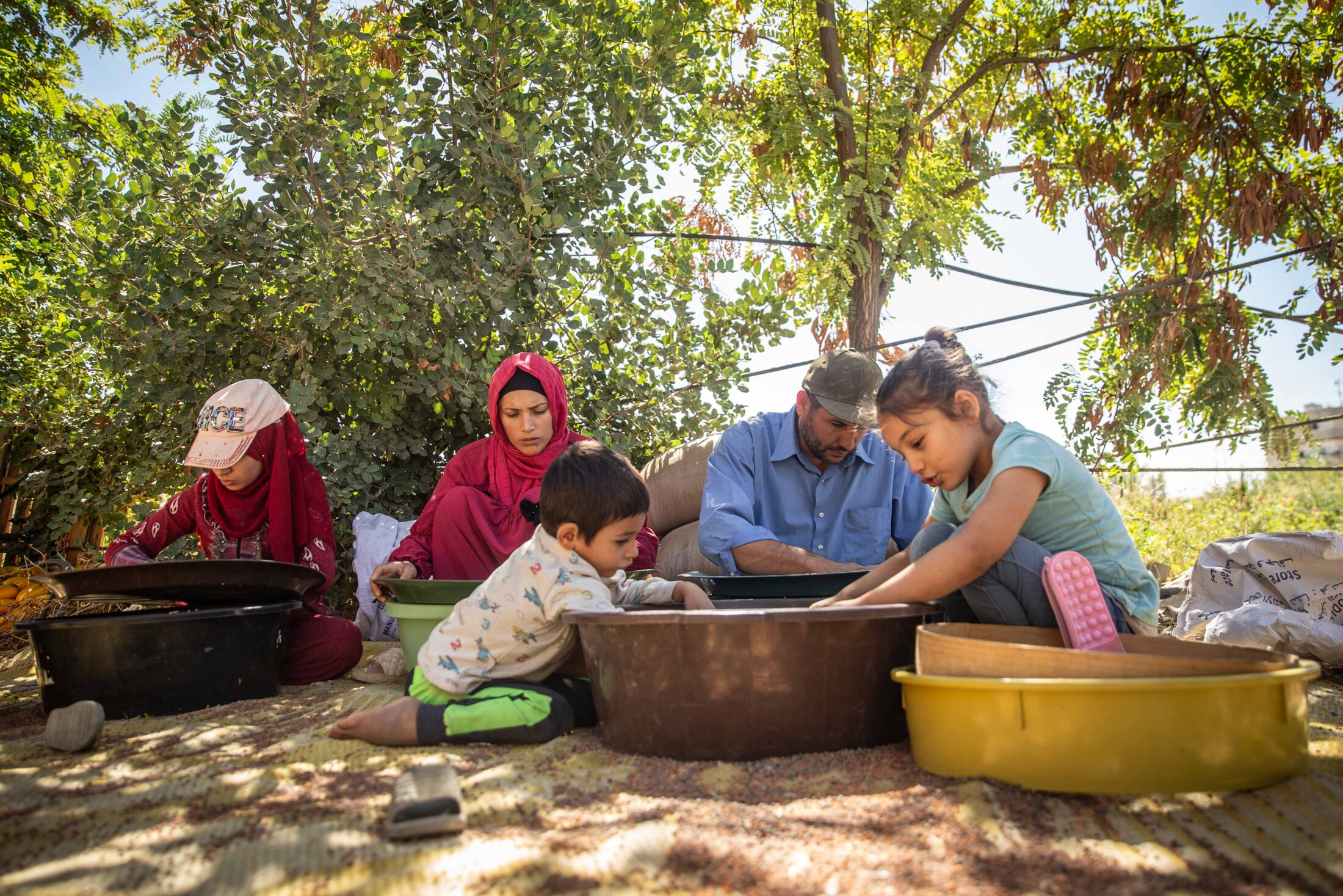 Walid Youssef et sa famille nettoient et trient des lentilles que le collectif va envoyer aux cuisines solidaires à travers le Liban pour nourrir les personnes déplacées par la guerre.