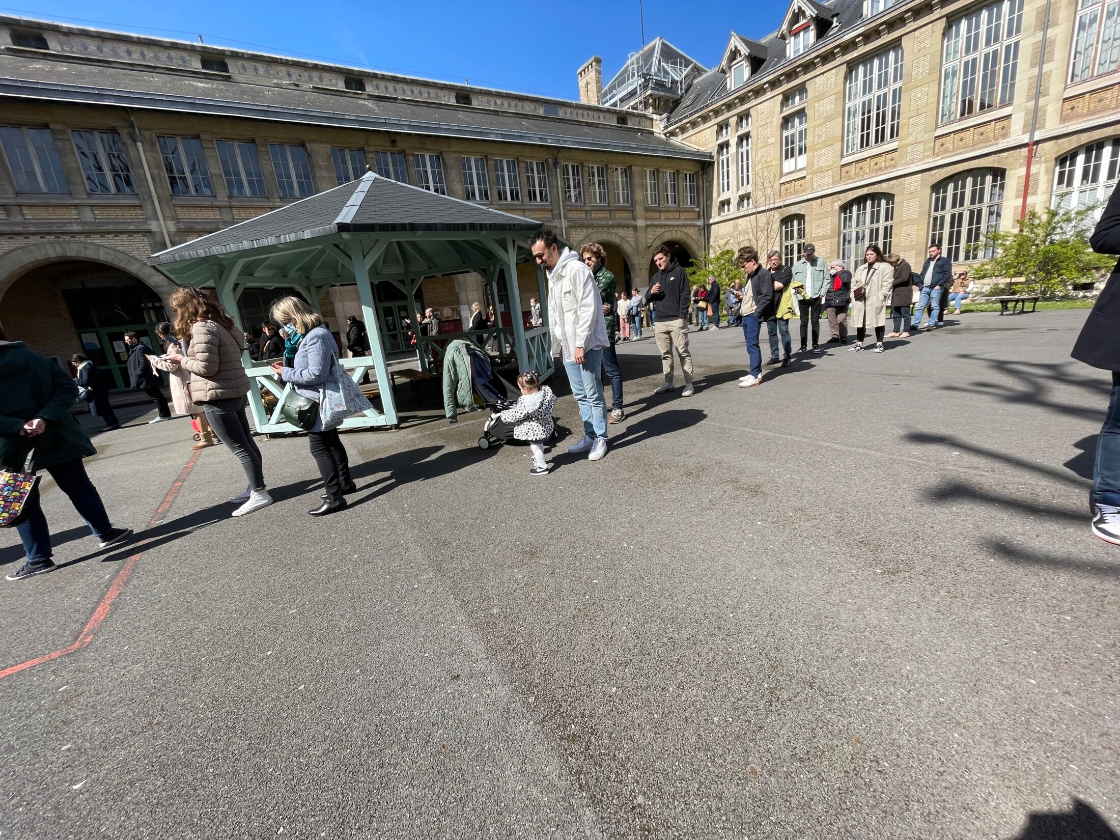 Photo: moitié de la queue à 12h de deux bureaux de vote, sur trois au total, à Paris.