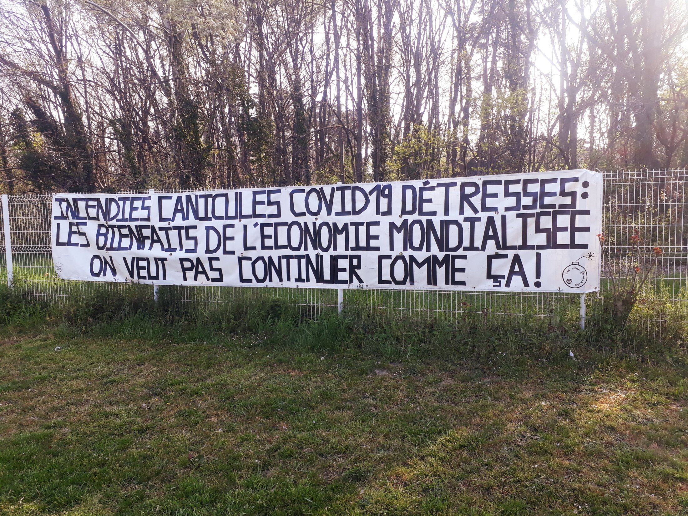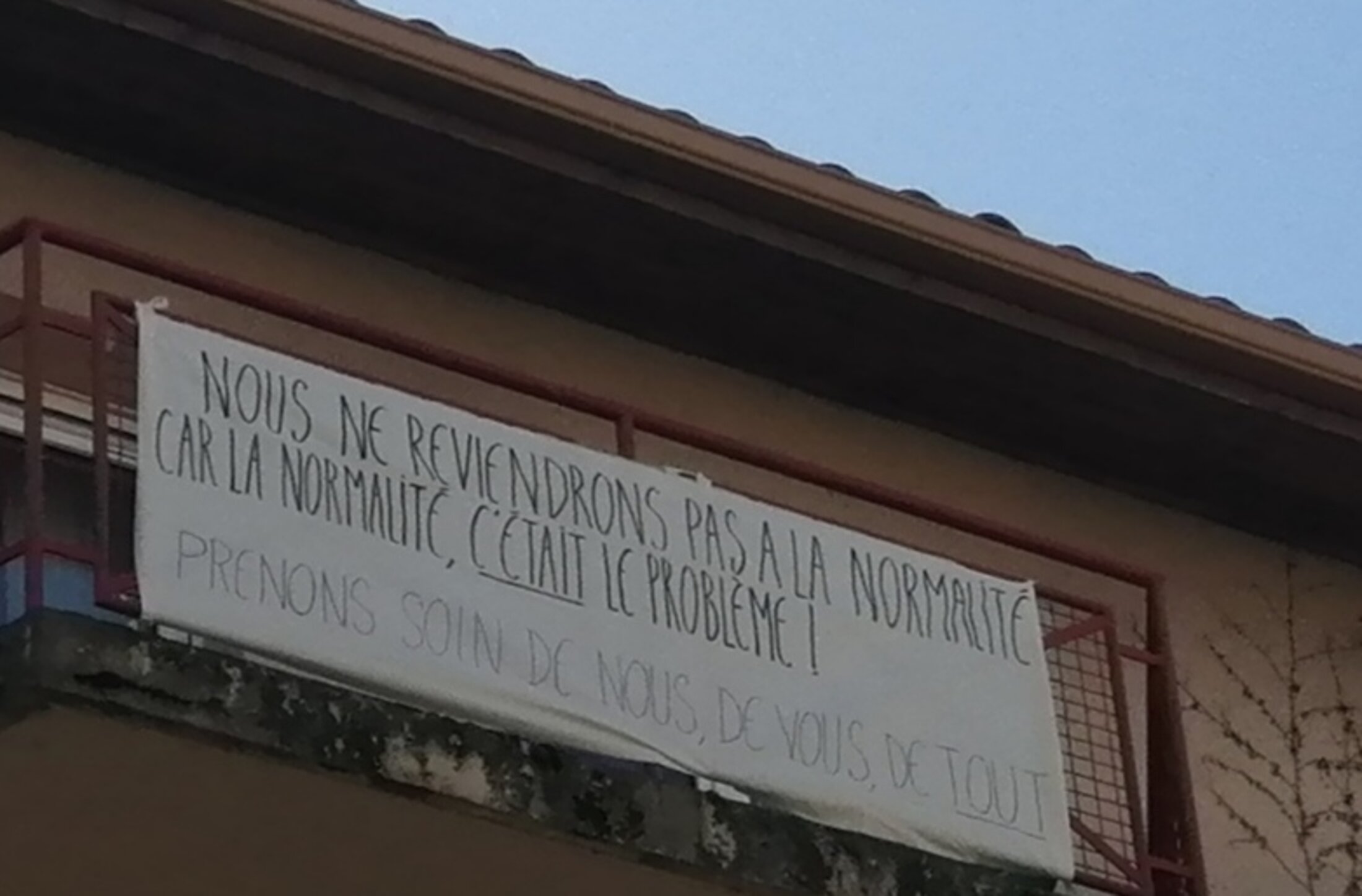 Y'a du monde au balcon Significations: Expression populaire du 19ème siècle rendant hommage au décolleté d'une femme. ou: Expressions populaires nées au printemps 2020 pendant le confinement de 4 milliards d'êtres humains et se déployant sur les balcons. Principalement en soutien aux soignants, elles devinrent aussi l'exigence par les peuples du monde entier d'une gouvernance économique sociale solidaire et écologique. La banderole a été posée le 2 avril 2020 à 19h et a disparu 22h après, alors faire parler nos balcons car ils ne peuvent pas les faire taire! Ce texte a été écrit à 4 mains confinées Nora et Elisabeth