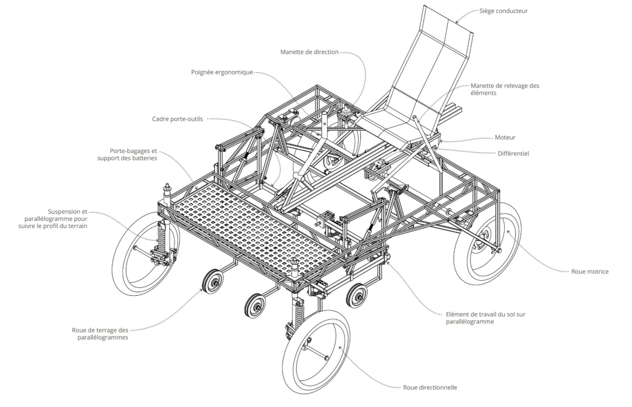 - Une ambition « low-cost + low-tech » : l’objectif est que les machines coûtent le moins cher possible et soient le plus simple possible à utiliser et, surtout, à réparer. Le résultat est des outils qui répondent à des besoins précis, utilisant peu de matières et le plus possible dans leur forme brute, avec des assemblages réversibles, en réduisant la complexité de la conception pour faciliter la maintenance et le démontage éventuel, etc.
