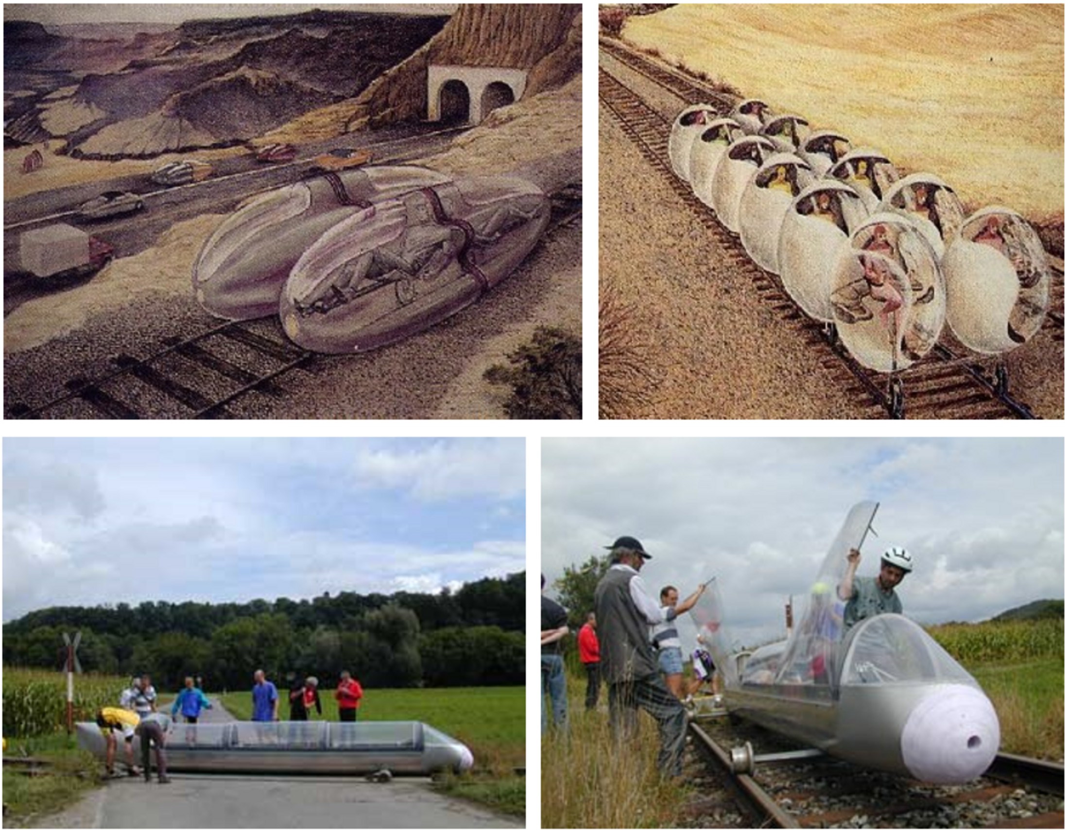 Evidemment, il ne manquera pas d’y avoir des tas d’expérimentations pour innover sur le sujet. L’expérience du TGV-vélo (ou vélotrain) est en ce sens amusante, elle offre une façon de se déplacer plus rapide et moins fatigante que le vélo, et illustre concrètement une innovation low-tech pour la mobilité. Le vélotrain (images ci-dessous) pourrait atteindre 100 km/h et demanderait une énergie de l'ordre de 1 à 1,5 Wh/km par personne, contre 5 à 10 Wh/km pour les trains actuel et 45 Wh/km pour le TGV «classique».