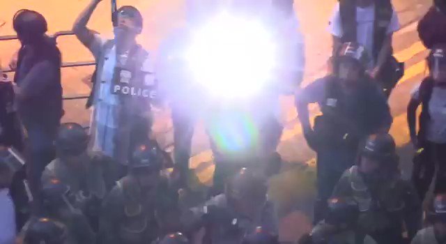Dans cette vidéo diffusée le 30 juillet sur Twitter, on voit à gauche un policier tenir une petite caméra sur pied déstinée à filmer les manifestants. Cet équipement serait le dispositif standard de la police hongkongaise, selon le blogueur hongkongais “Hong Kong Hermit” interrogé par notre rédaction. Au milieu de l'image, un autre policier vise celui qui le filme avec une lampe torche pour perturber la prise de vue.