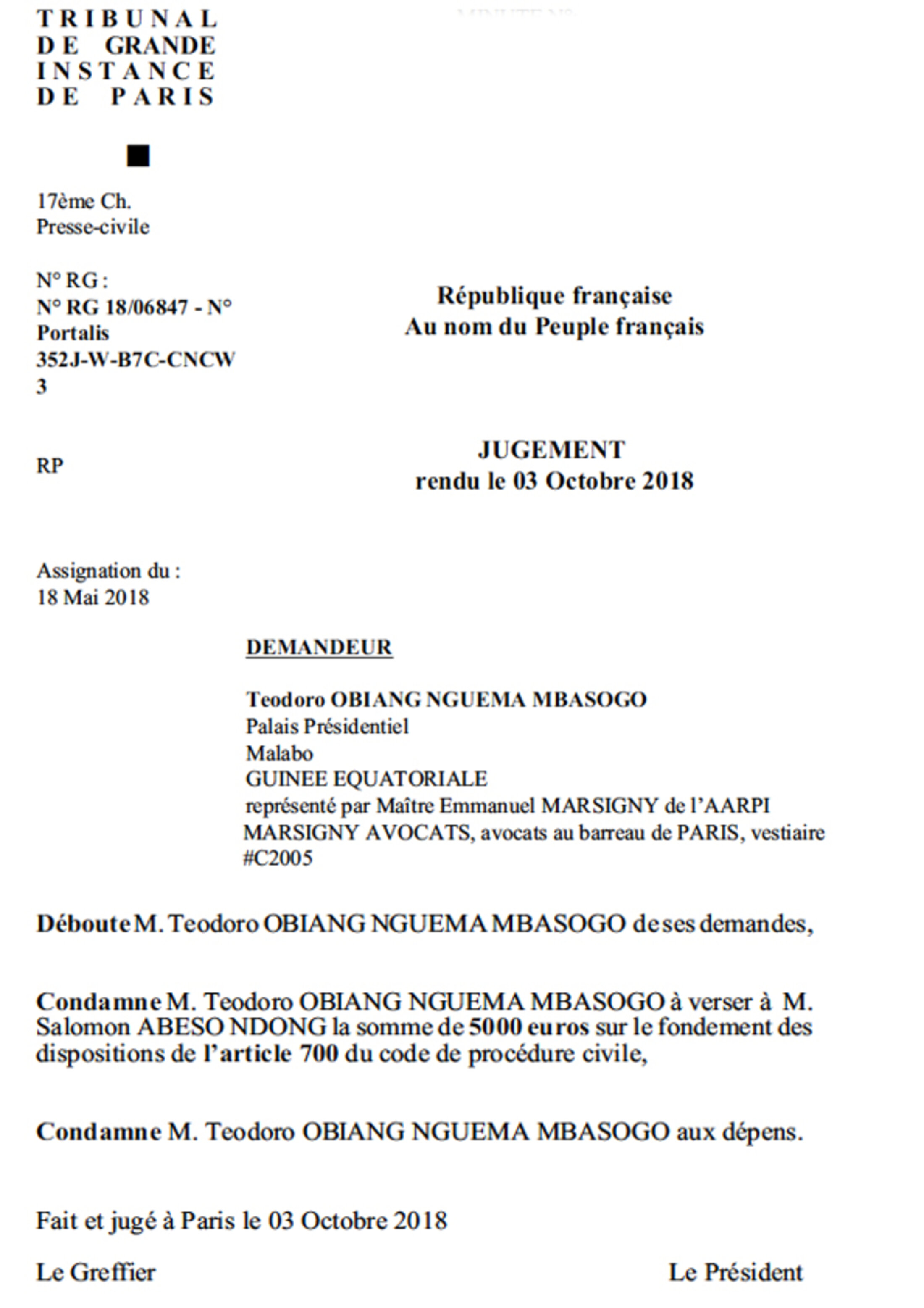 Cette action criminelle intervient au lendemain de la condamnation du Président TEODORO OBIANG NGUEMA MBASOGO survenue le 3 octobre 2018, à verser la somme de 5.000 euros à SALOMON ABESO NDONG qui sur la base d'informations factuelles parues dans la presse, mais aussi en provenance des réseaux d'informateurs qui le renseignent en permanence, avait affirmé dans MEDIAPART puis devant le tribunal, avec l'aide de ses avocats que le mandataire équato-guinéen avait :