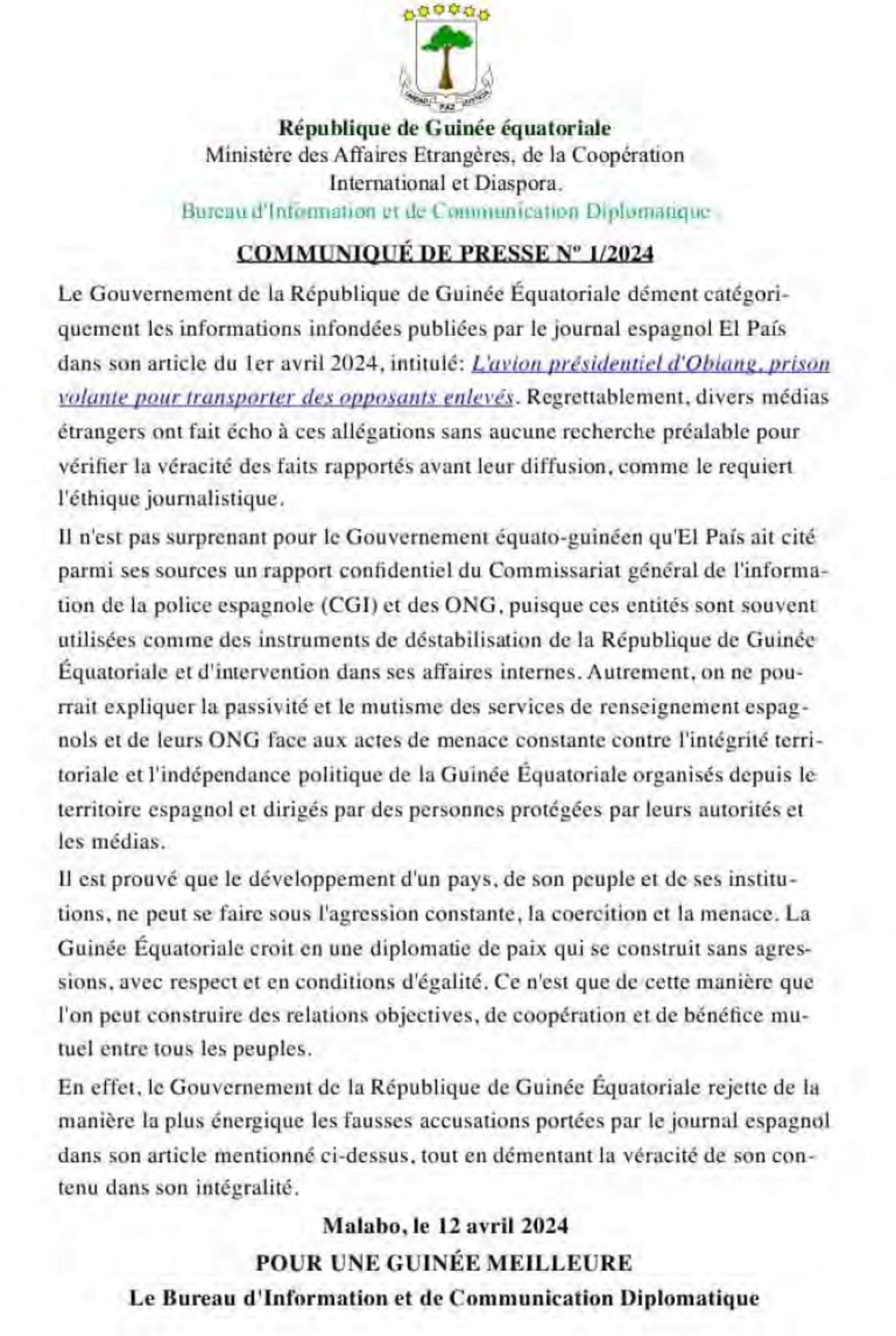 donne de multiples détails sur ce qui précède et qui doivent être dénoncés sur le plan international, les gesticulations diplomatiques par voie de communiqués ne reposant sur aucune base réelle, le ministère qui vient de publier ce communiqué se comporte comme une officine de propagande chargée de dissimuler les crimes d’un régime qui se maintient au pouvoir non seulement par "la triche électorale institutionnalisée", mais aussi par les enlèvements et assassinats des opposants réfugiés politiques en exil, ces deux choses ayant permis de faire durer la dictature en guinée équatoriale sans interruption depuis un demi-siècle.
