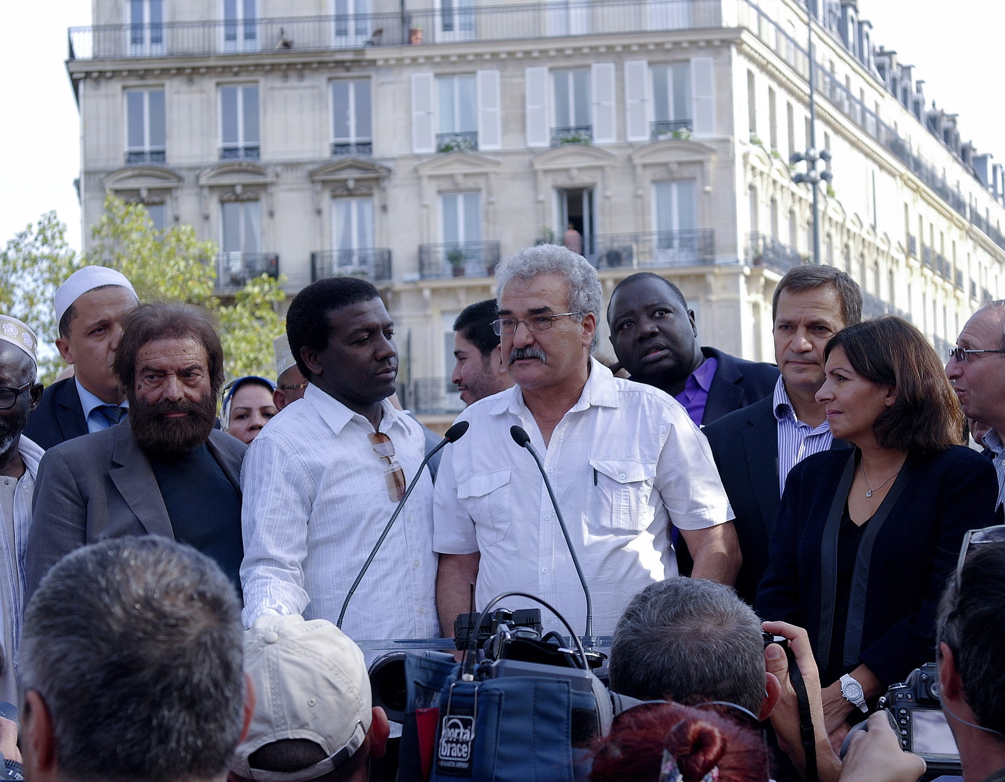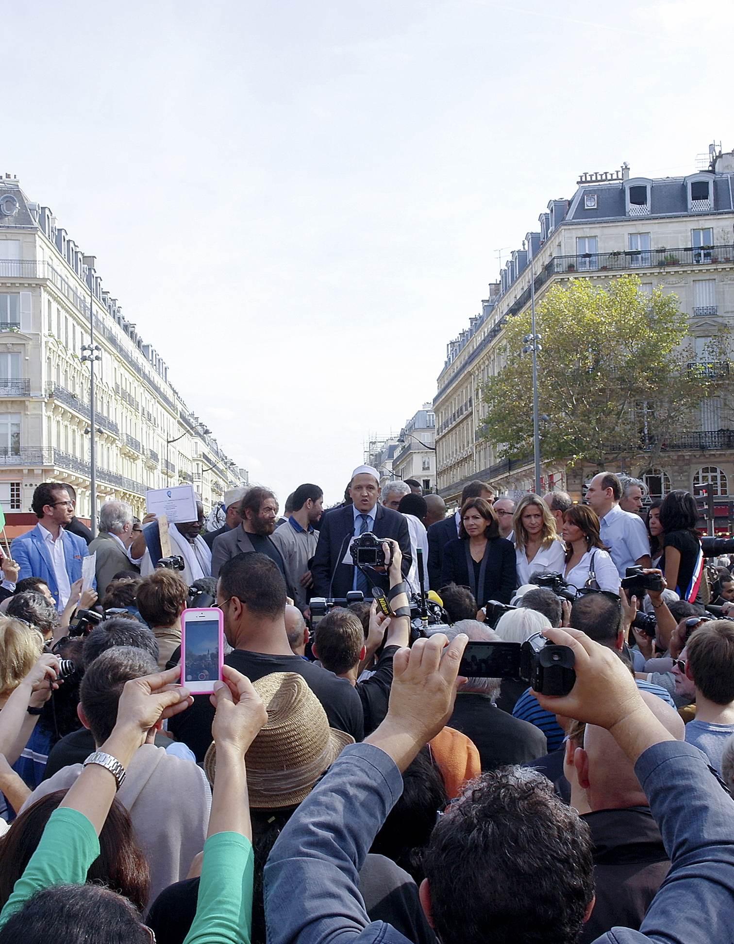 Au milieu de la place avait été érigée une tribune, où des orateurs ont pris la parole à tour de rôle, avec notamment l'imam de Drancy (93) Hassen Chalghoumi qui a lancé à la tribune: "Nous sommes tous à leurs yeux des sales Français, mais aujourd'hui nous sommes tous unis pour crier notre colère et dénoncer ces barbares qui ont tué notre frère" (la phrase retenue par l'AFP), ou l'écrivain Marek Halter qui s'est félicité que la manifestations ait attiré plusieurs centaines de personnes quand il craignait de trouver, tout au plus, quelques dizaines de manifestants....
