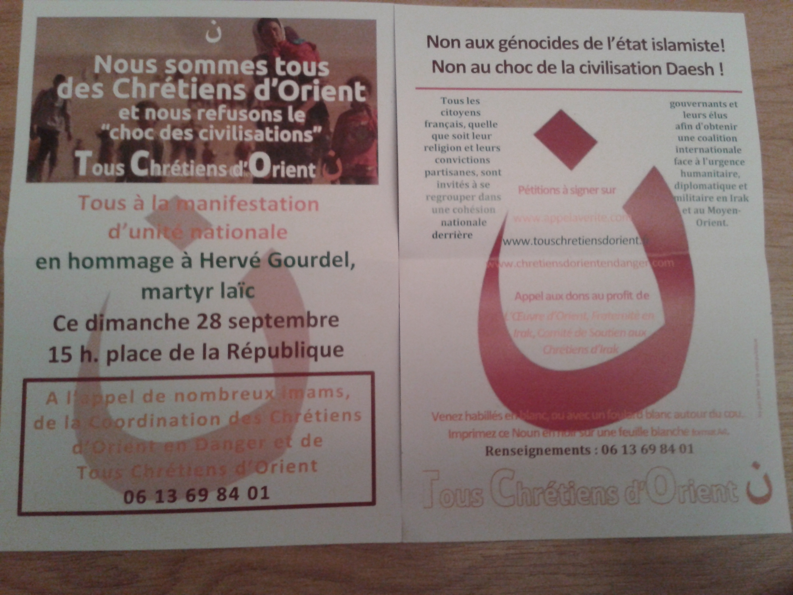 Notez que le texte de l'appel au rassemblement, ainsi que la liste de ses signataires, se trouve ici: http://www.humanite.fr/assassinat-dherve-gourdel-les-djihadistes-ne-nous-diviseront-pas-552990 (également sur Médiapart: http://blogs.mediapart.fr/blog/poppie/280914/marche-unitaire-du-28-septembre )