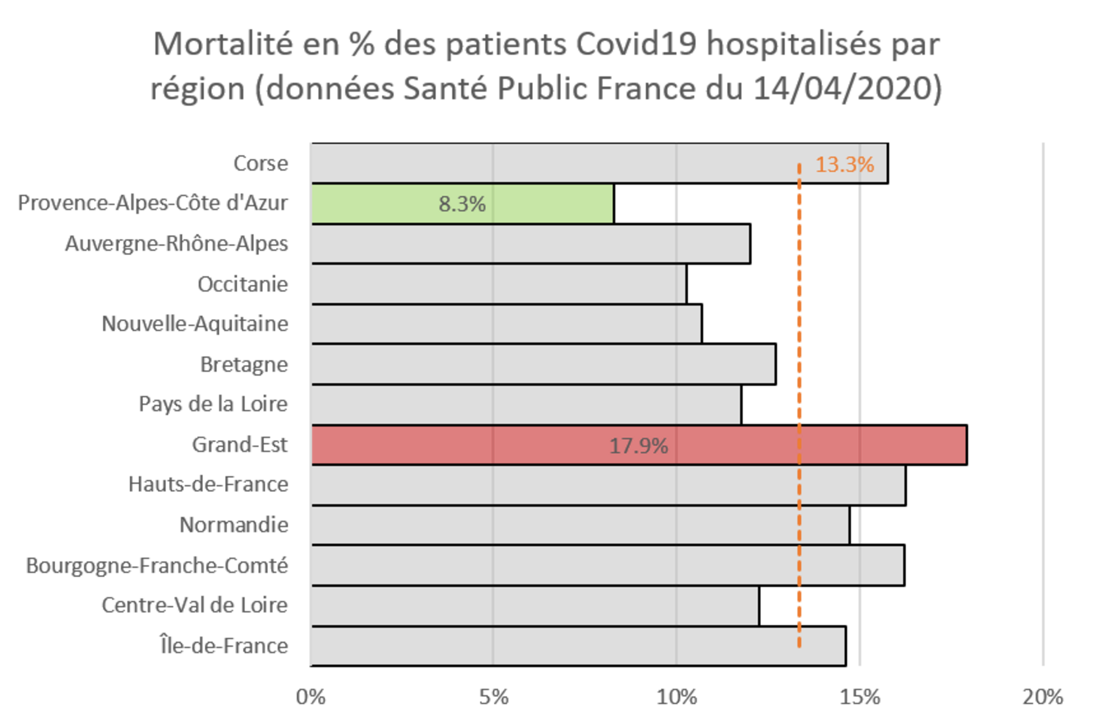 A noter un facteur supérieur à deux entre le taux de mortalité en région PACA (8%) et celui en région Grand Est (18%).