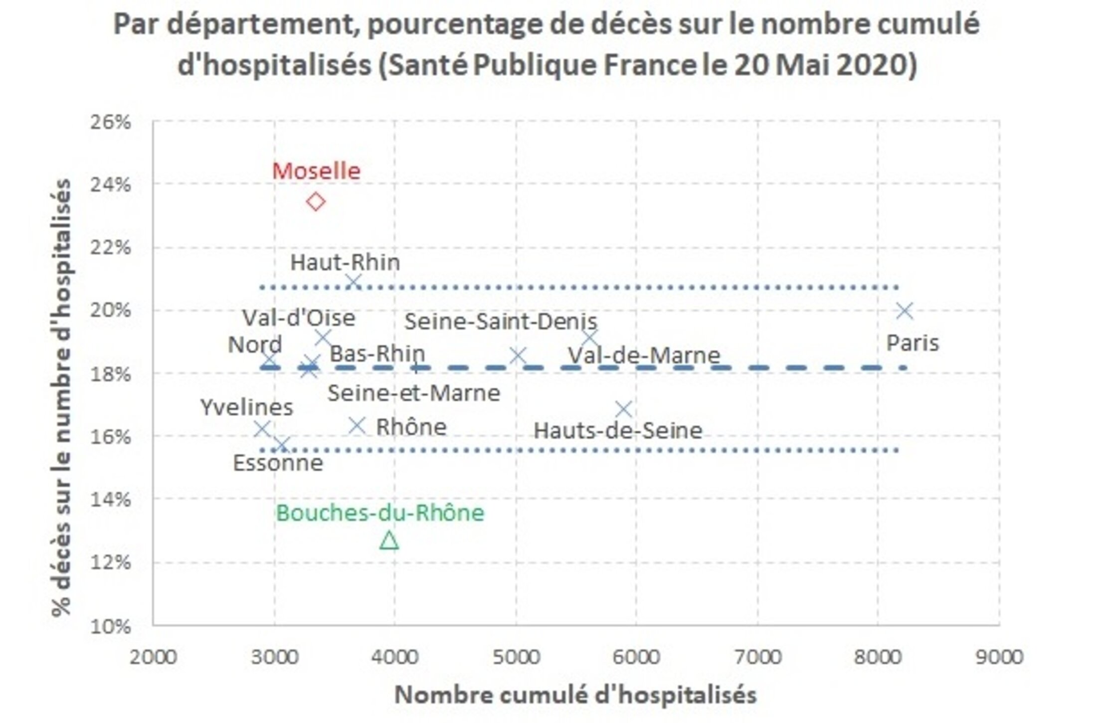 Les données Santé Publique France permettent de visualiser le pourcentage de décès par rapport au nombre d'hospitalisés par département en France au 20 Mai 2020 :