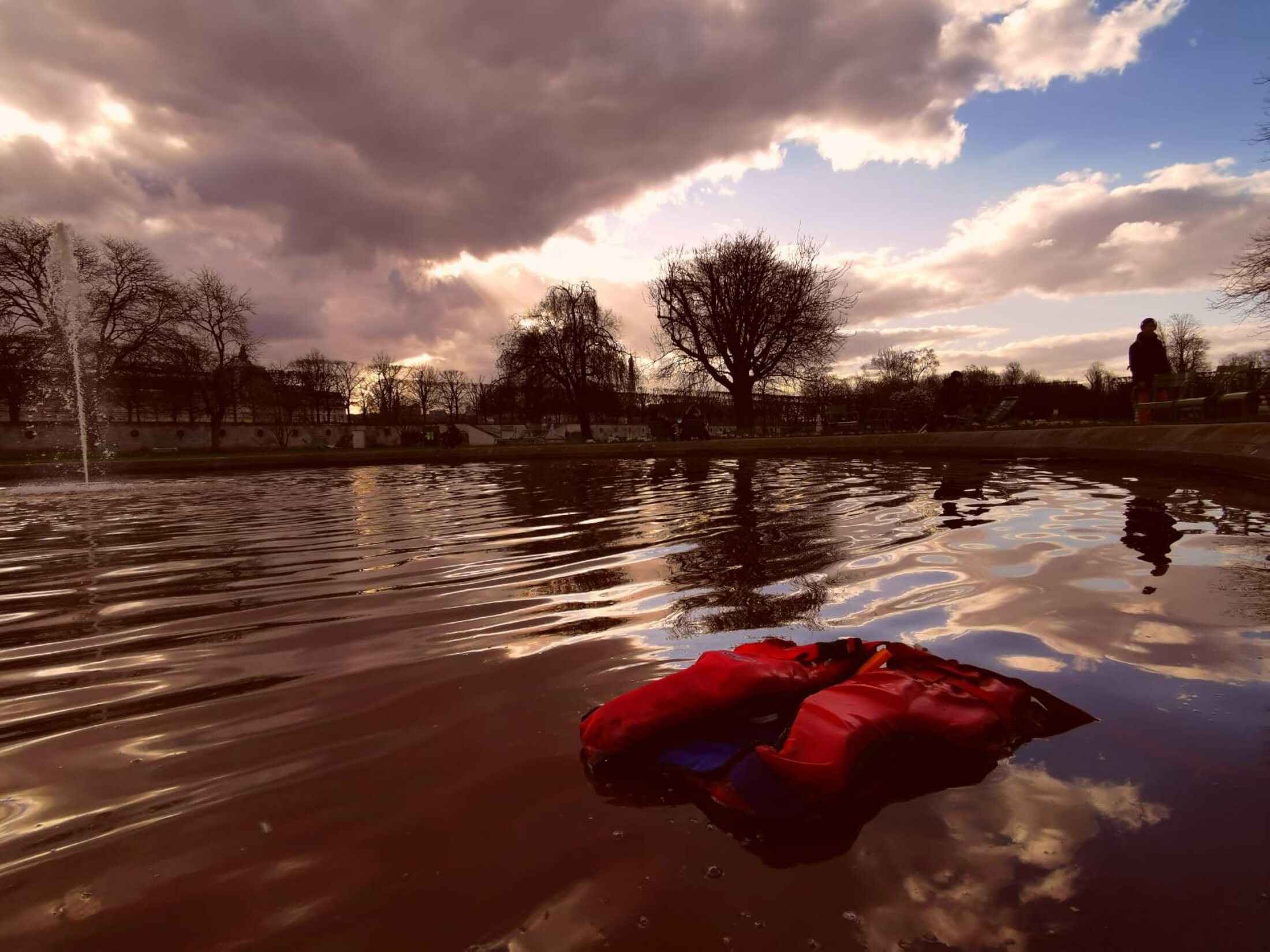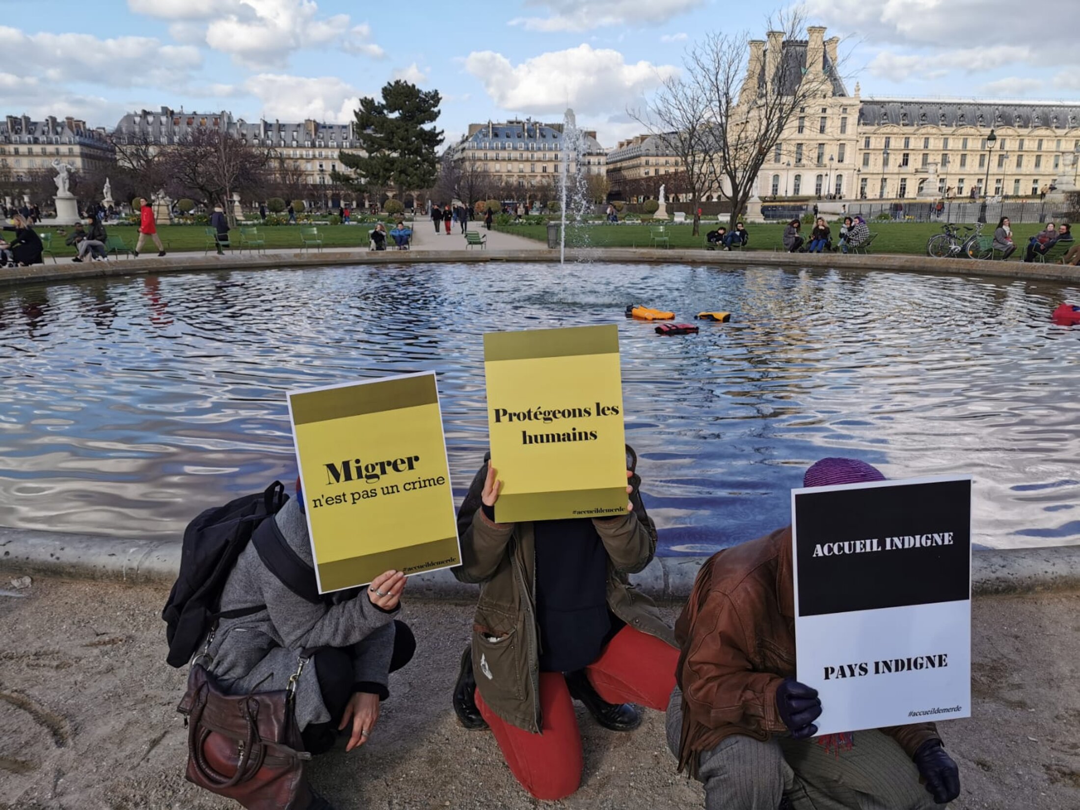 Aujourd’hui, par cette mise en scène aux Tuileries, nous cherchons à mettre en lumière par l’eau rouge de cette fontaine la continuité entre les mort-e-s en Méditerranée et les mort-e-s dans les rues de Paris. Ce sont les conséquences tragiques des politiques de non-accueil européenne et française. En 2015, l’Europe était sous le choc de la mort d’Alan Kurdi. En 2020, nous refusons de nous habituer au sort réservé aux exilé-e-s.