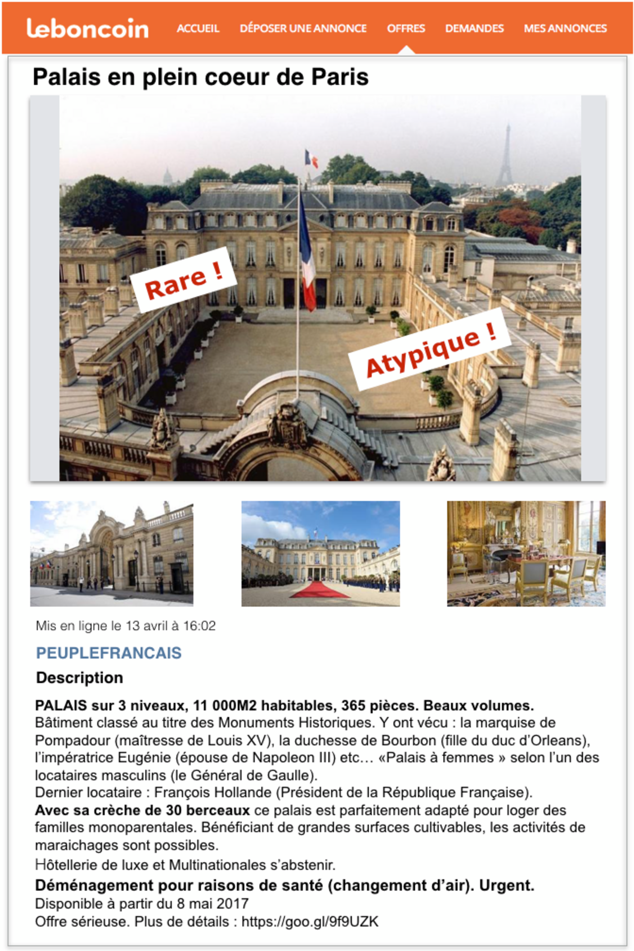 Aucun des prétendants de la présidentielle 2017 - tous pourtant "antisystème" - n’a évoqué le sujet des lieux de pouvoir, ils sont donc tous prêts à venir présider dans l’ancienne chambre de l’impératrice Eugénie, épouse de Napoléon III, la pièce qui est devenue le bureau des Présidents. Ils sont aussi manifestement prêts à ce que la “première dame” fasse attendre ses visiteurs dans l’ancienne chapelle. Adopter un fonctionnement anti-système ne va pas de soi, il faut être aidé ! Les aider pour abandonner les vieilles pratiques mais surtout les aider pour le choix de la nouvelle résidence : pas d’ancienne résidence royale (Château de Vincennes), pas d’ancienne école royale (l’École Militaire), rien de royal. Il faut trouver un lieu qui puisse incarner ce que devra être un lieu de pouvoir pour les 100 prochaines années. Un bâtiment adhoc mais aussi une localisation adhoc : rive droite ? rive gauche ? À l’intérieur ou à l’extérieur du périphérique ? En Ile-de-France ? Au centre de la France dans le triangle Vierzon, Châteauroux, Bourges ? … ?